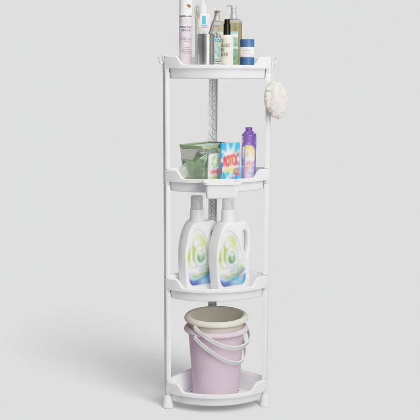 رف تخزين متعدد الطبقات مصمم ليناسب الزوايا بشكل مثالي، مما يساعد على استغلال المساحات الضيقة بفعالية. مصنوع من البلاستيك الأبيض،. يمكن استخدامه في الحمام لتنظيم مستحضرات التجميل والمناشف، أو في غرفة النوم لوضع الكتب والأغراض الشخصية، أو حتى في المطبخ لتخزين التوابل والأدوات. إنه حل عملي وموفر للمساحة لتنظيم أي جزء من المنزل
