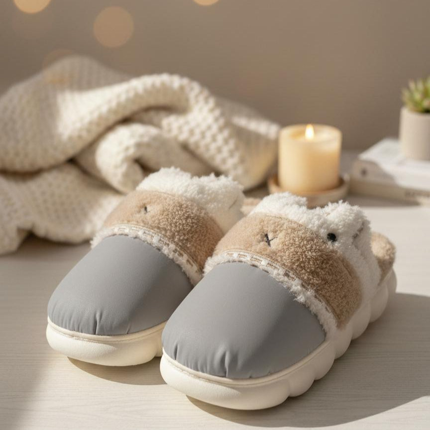 خف للأولاد، مثالي للحفاظ على دفء وجفاف أقدامهم في المنزل. يتميز ببطانة داخلية من الفرو الأبيض الدافئ وغطاء أمامي مقاوم للماء (وتر بروف)