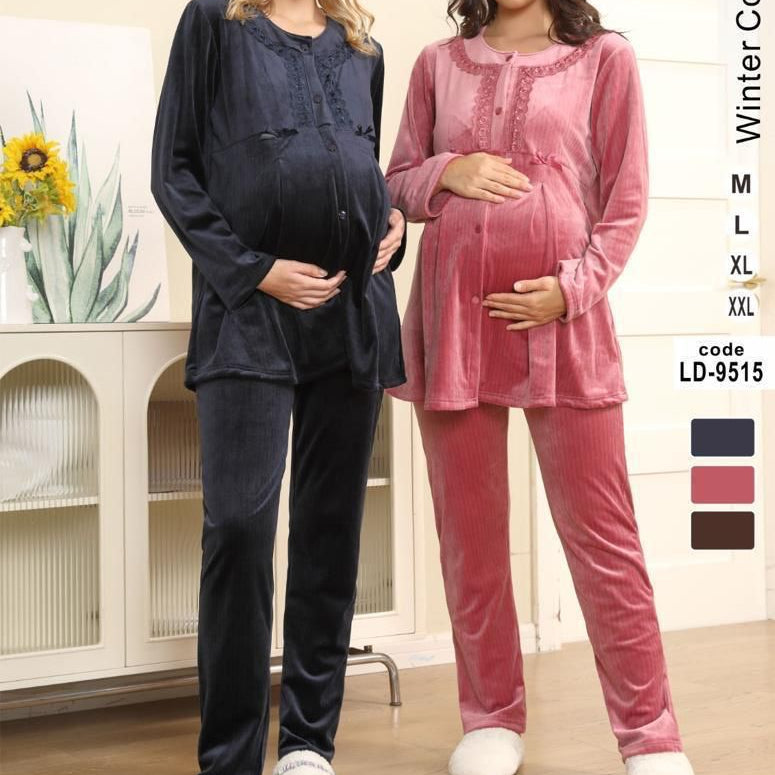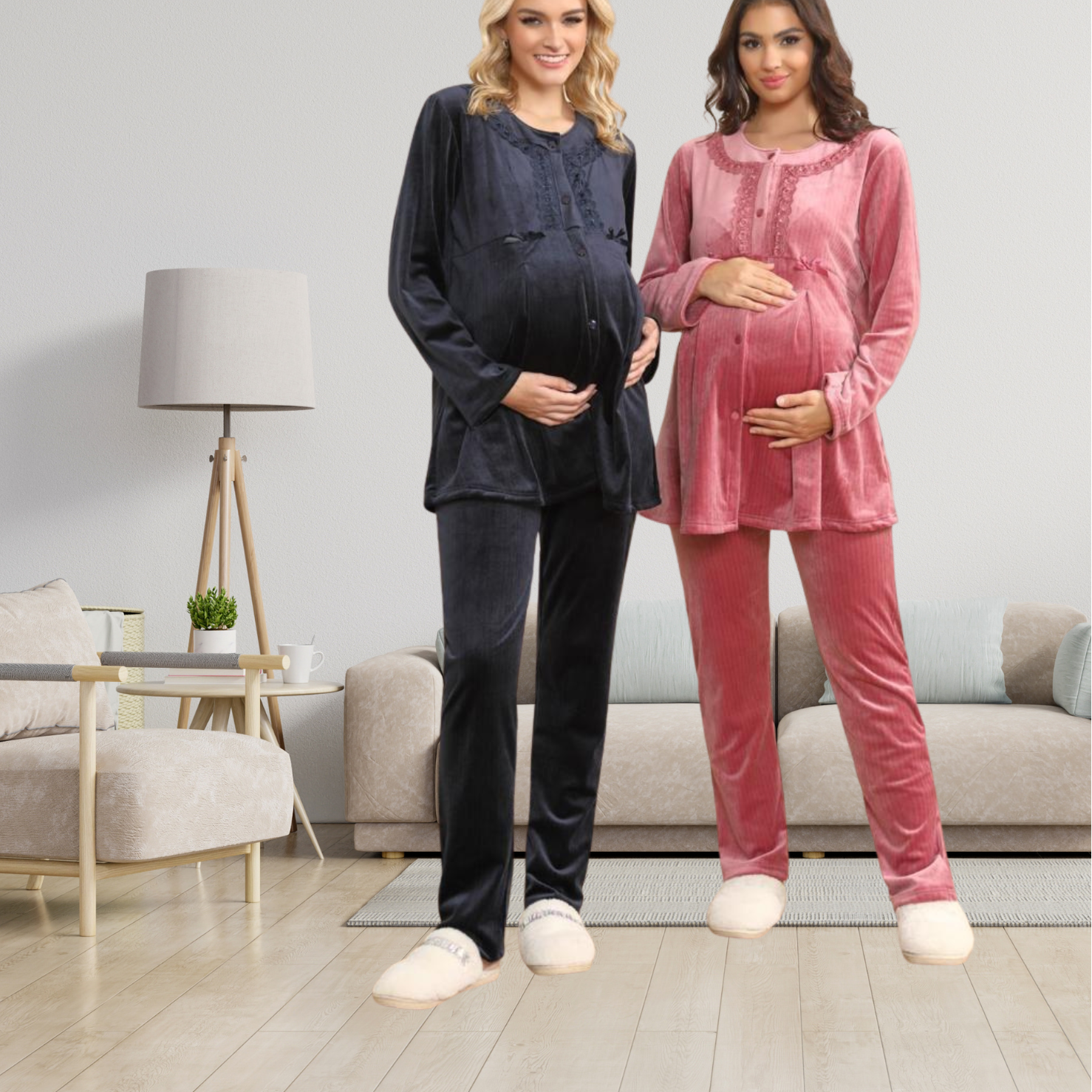 بيجامات حمل مخملية، مخصصات للحوامل. البلوزة بتكون واسعة وطويلة عشان تريح البطن، والبنطال كمان مريح.قماشهم مخملي وناعم عشان يدفّوا بالشتوية ويكونوا مريحين للحامل. شكلهم أنيق ومناسبين للبيت."