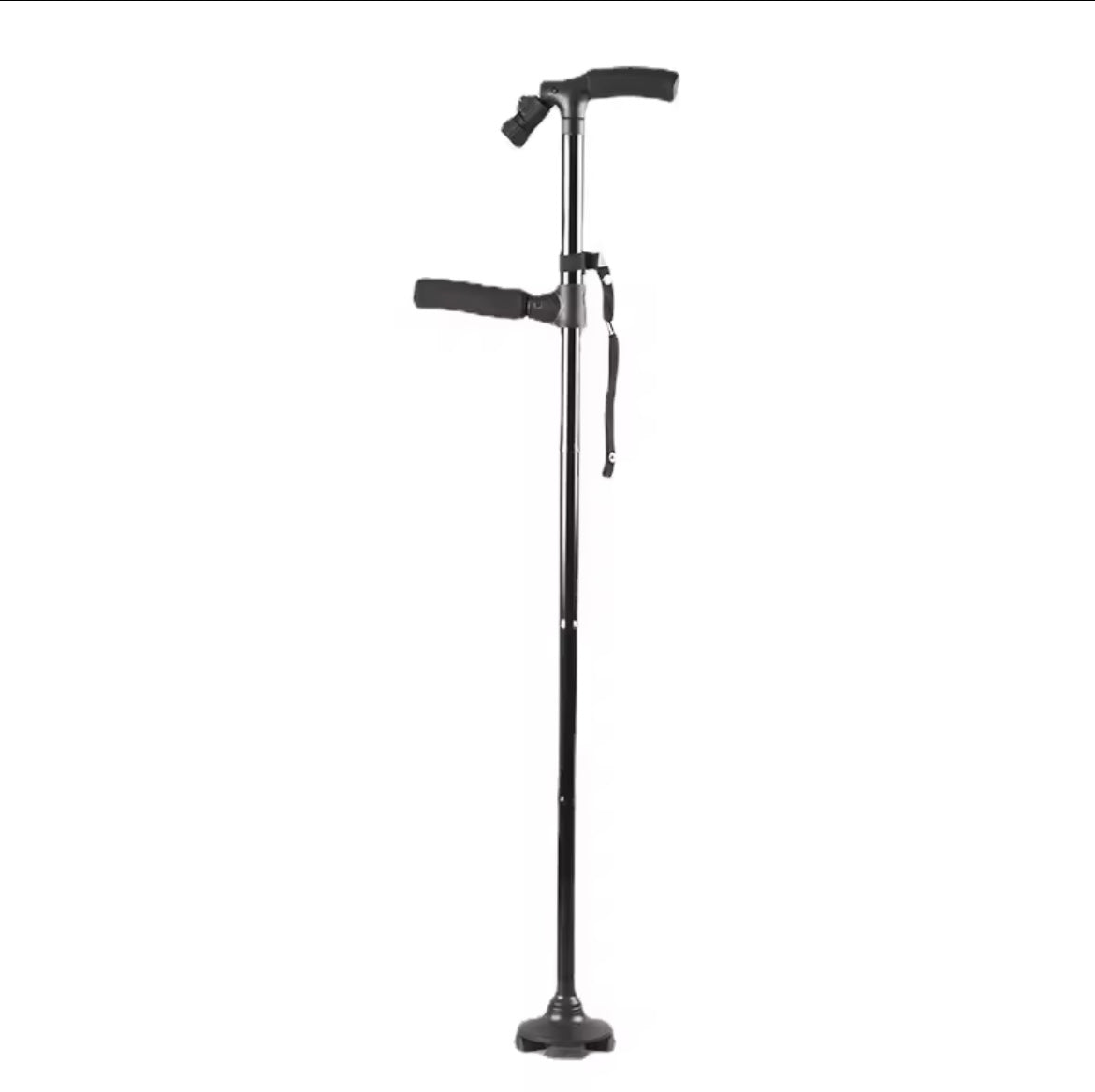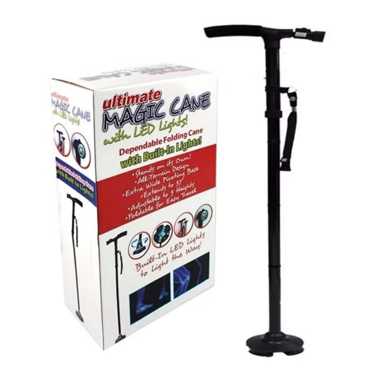 عصا للمشي، اللي بستخدموها كبار السن أو اللي عندهم مشاكل بالمشي. اسمها العصا السحرية لأنها فيها مميزات حلوة: بتوقف لحالها، بتنطوي عشان تصير صغيرة وسهلة للحمل، وبتقدر تطولها وتقصرها. كمان الحلو فيها إنه فيها ضو ليد عشان تضوي الطريق بالليل أو بالأماكن المعتمة. كتير مريحة وعملية."