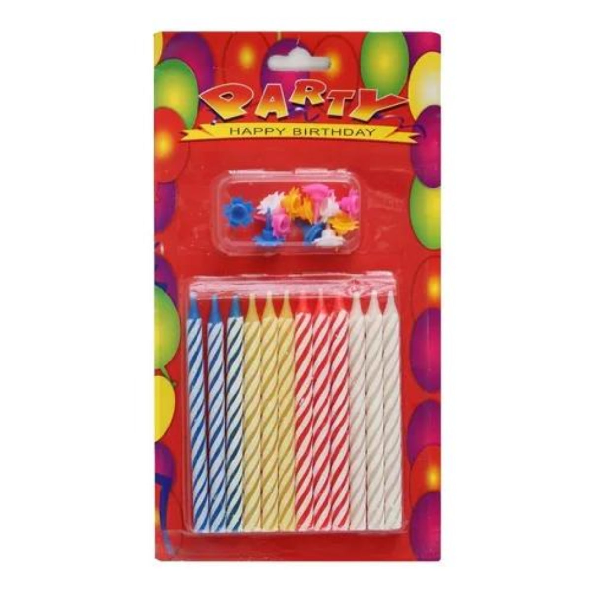 باكيت شموع عيد ميلاد فيها مجموعة شموع حلزونية الشكل بألوان مختلفة (أزرق، أصفر، أحمر، وأبيض). بيجي معها كمان علبة صغيرة فيها قواعد بلاستيكية ملونة على شكل وردة عشان تثبت الشموع بالكيكة. يعني كل شي بتحتاجه عشان تزين كيكة عيد الميلاد.