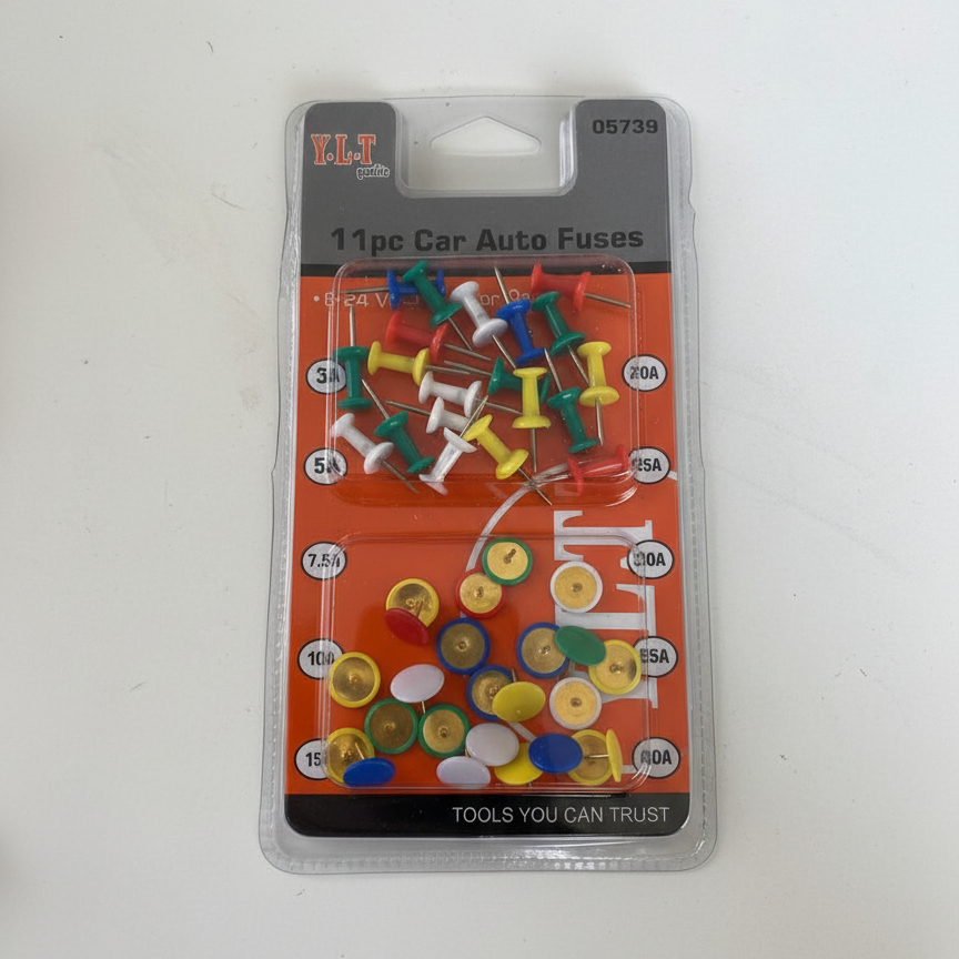 علبة دبابيس مكتب صغيرة، فيها ألوان مختلفة (أحمر، أصفر، أخضر، أزرق، أبيض)، بتستخدمها لتثبيت الورق أو أوراق الملاحظات عاللوح.