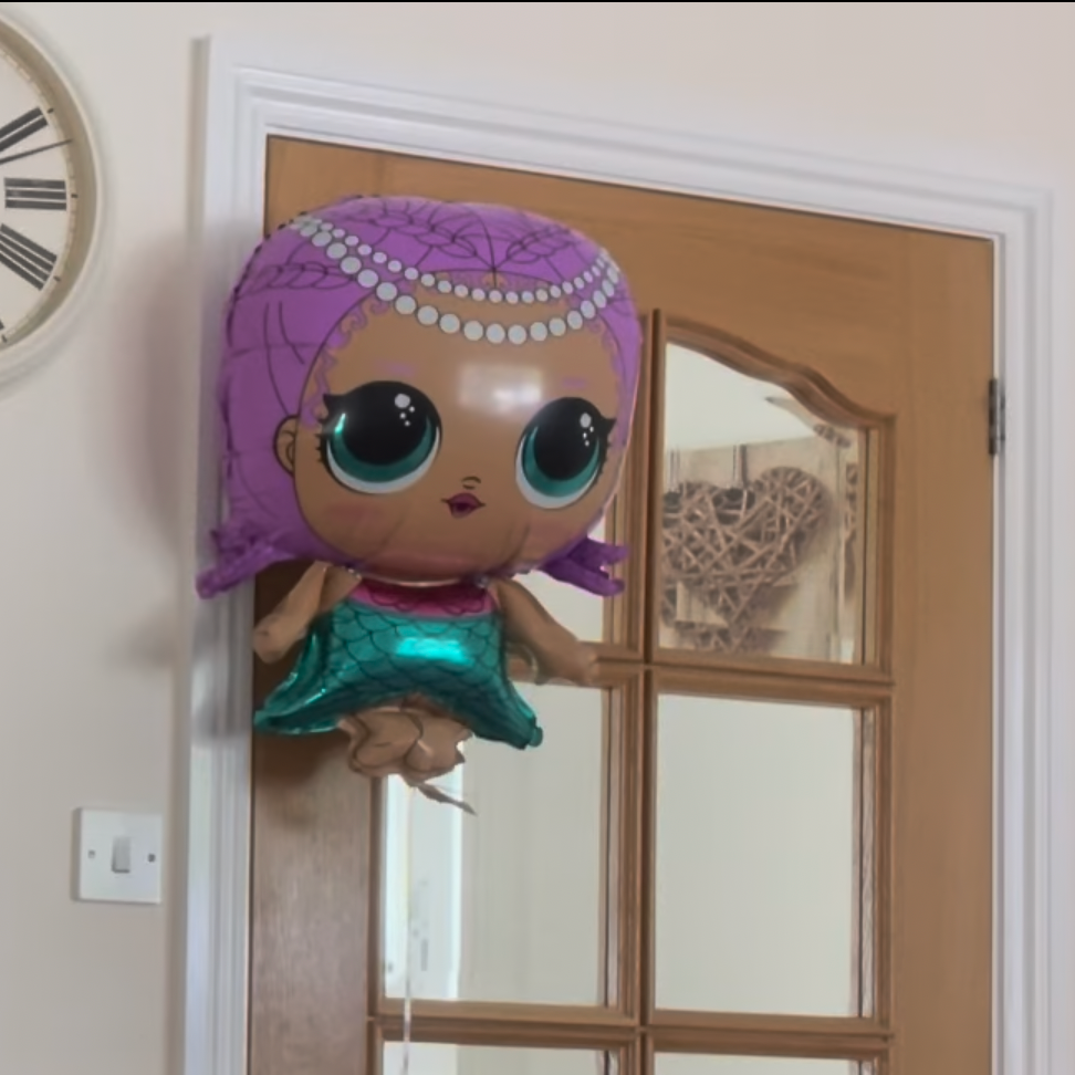 بلون كيوت على شكل بنّت حورية البحر بشعر بنفسجي وعيون كبار لامعين! 😍 مثالي لأعياد الميلاد، الحفلات، أو لتزيين غرفة البنوتة. خفيف وسهل النفخ، وبضيف جو فرح ولطافة للمكان! 💜