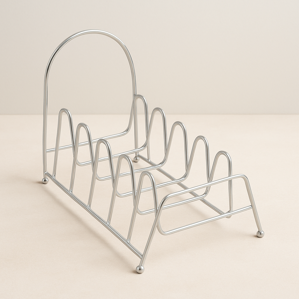 حامل عملي من المعدن المطلي باللون الذهبي، مصمم لتنظيم أغطية القدور والمقالي والصحون بطريقة مرتبة وموفرة للمساحة. يحتوي على عدة فتحات لتثبيت الأغطية بأحجام مختلفة، ويمكن وضعه داخل الخزائن أو على سطح المطبخ لسهولة الوصول والتنظيم