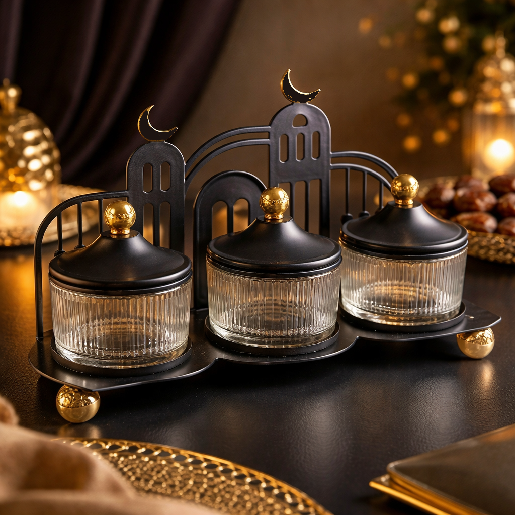 قم ضيافة أنيق مكوّن من 3 علب لتقديم المكسرات أو الحلويات، بتصميم رمضاني مميز مع خلفية زخرفية على شكل مساجد وهلال. الطقم مصنوع من قاعدة معدنية باللون الأسود مع أغطية بلمسة ذهبية فاخرة، وأكواب زجاجية شفافة مناسبة لتقديم المكسرات، التمر، الشوكولاتة أو الضيافة المتنوعة. مثالي للاستخدام اليومي خلال شهر رمضان أو للتقديم في العزائم، كما يُعد خيارًا رائعًا للهدايا الرمضانية الراقية.