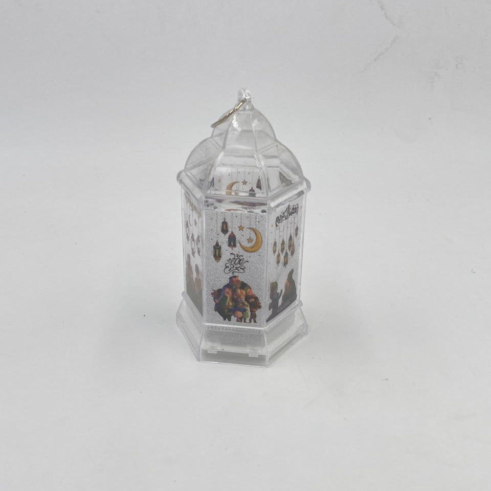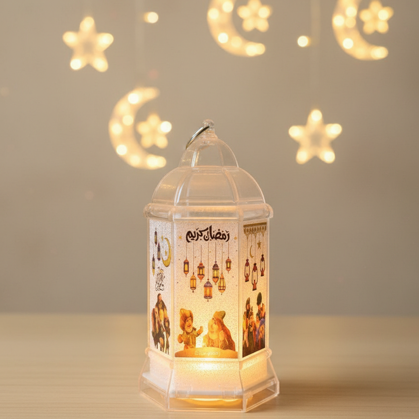 فانوس رمضاني خفيف مصنوع من البلاستيك الشفاف، مزين بعبارة «رمضان كريم» ورسومات فوانيس وشخصيات رمضانية