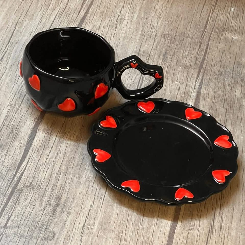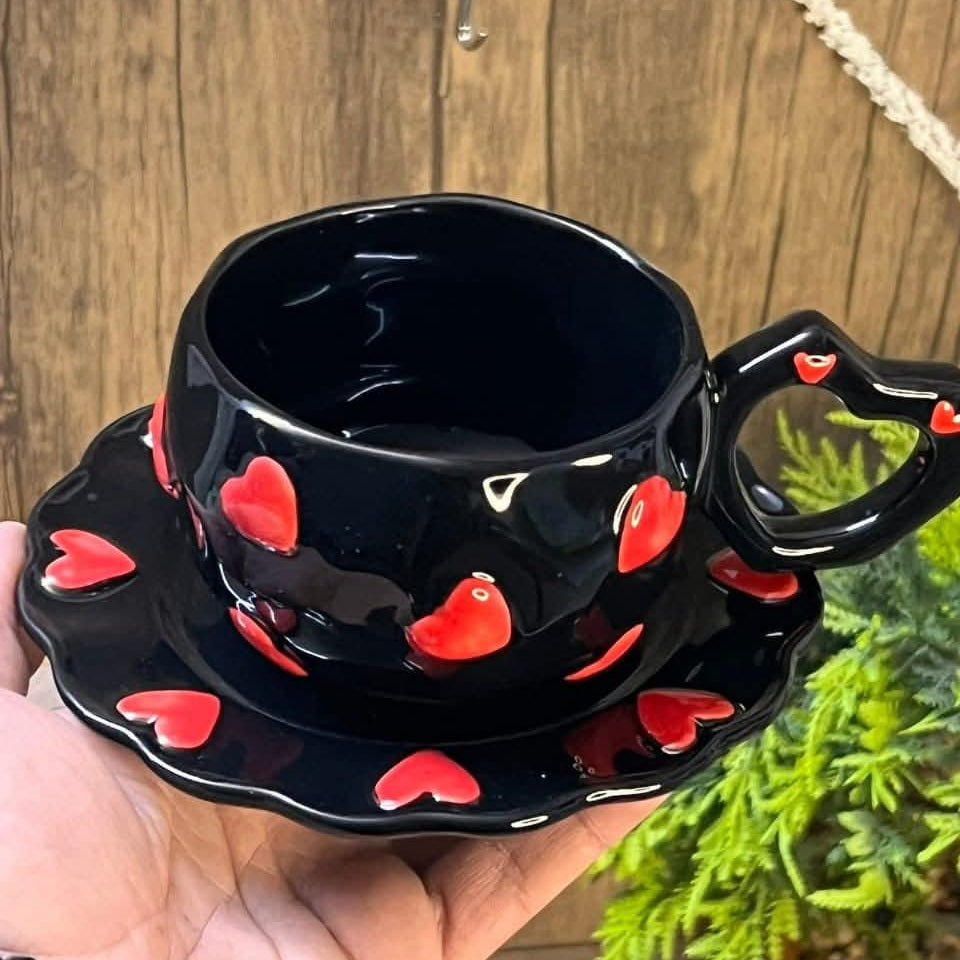 فنجان قهوة أسود أنيق مع صحن، مزين بقلوب حمراء حلوة تعطيه لمسة رومانسية وناعمة. مناسب للقهوة، الشاي، أو أي مشروب تحبه. تصميمه مميز ومرتب، مثالي للاستخدام اليومي أو كهدية لطيفة للي بتحبهم. الخامة متينة وسهلة التنظيف، ويضيف شكل جميل لأي طاولة.