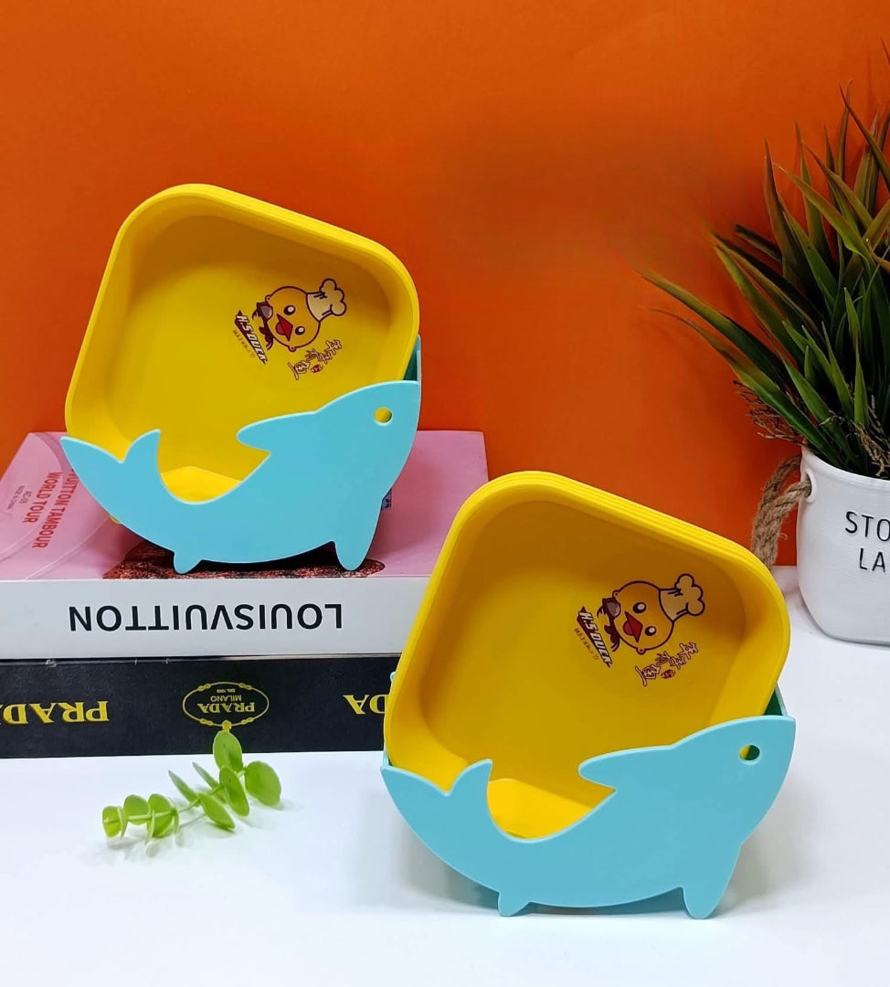 طقم من اربع صحون بلاستيكية مرحة للاطفال مع قاعدة على شكل سمكة القرش