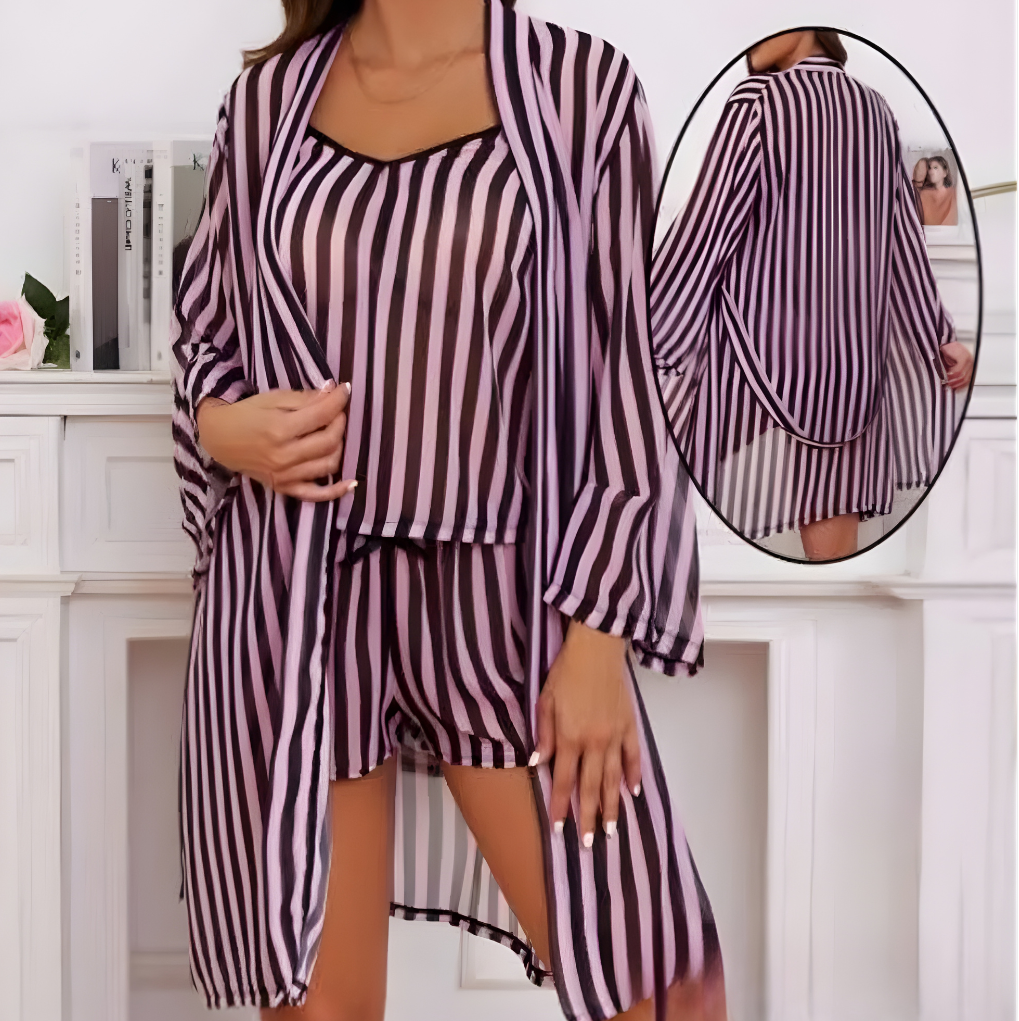 طقم بيجامة شيفون ناعم مكوّن من ثلاث قطع بخطوط أنيقة 😍 خفيف ومريح، بيعطي لوك مرتب وناعم بالبيت ✨