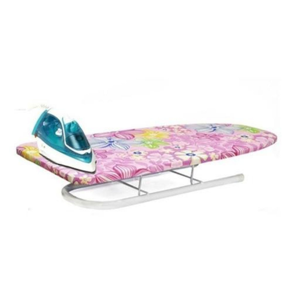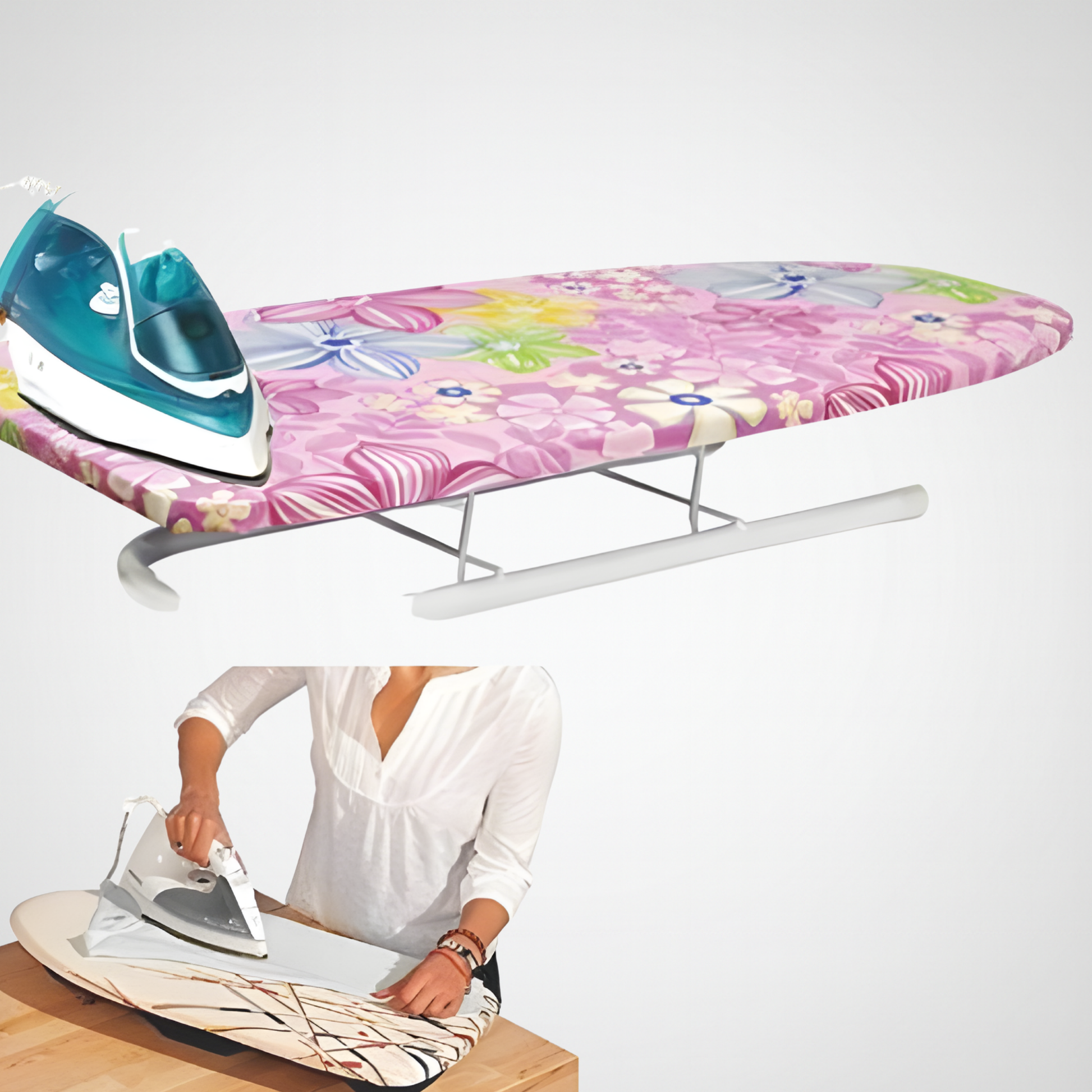 الحجم والتصميم: طاولة كي صغيرة الحجم (يبلغ طولها حوالي 60 سم )، مصممة للاستخدام على سطح طاولة أو مكتب بدلاً من الوقوف على الأرض.