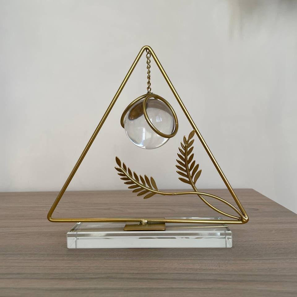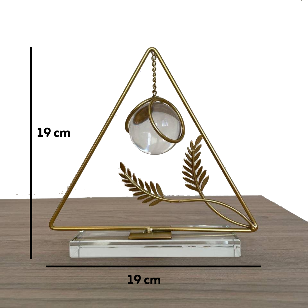قطعة ديكور فنية وأنيقة مصممة لتزيين المكاتب، الأرفف، أو الطاولات الجانبية. تتميز بإطار معدني ذهبي اللون على شكل مثلث، وتتدلى من قمته كرة زجاجية شفافة أو كريستالية. يضاف إلى التصميم لمسة طبيعية عبر فرعين معدنيين على شكل أوراق شجر. القطعة مثبتة على قاعدة شفافة وثقيلة، مما يمنحها مظهرًا عصريًا وراقيًا.