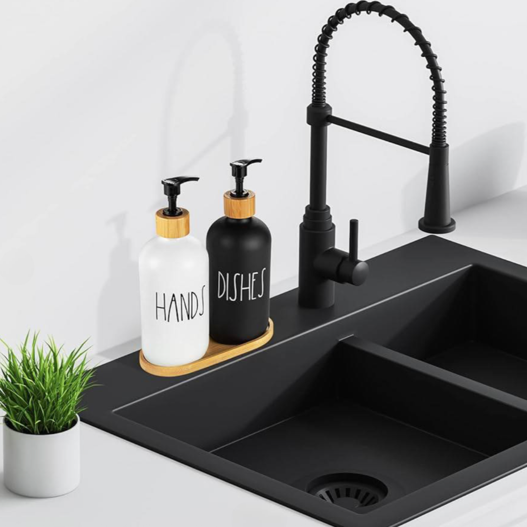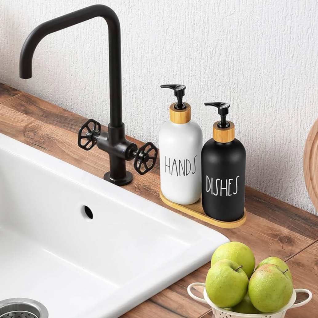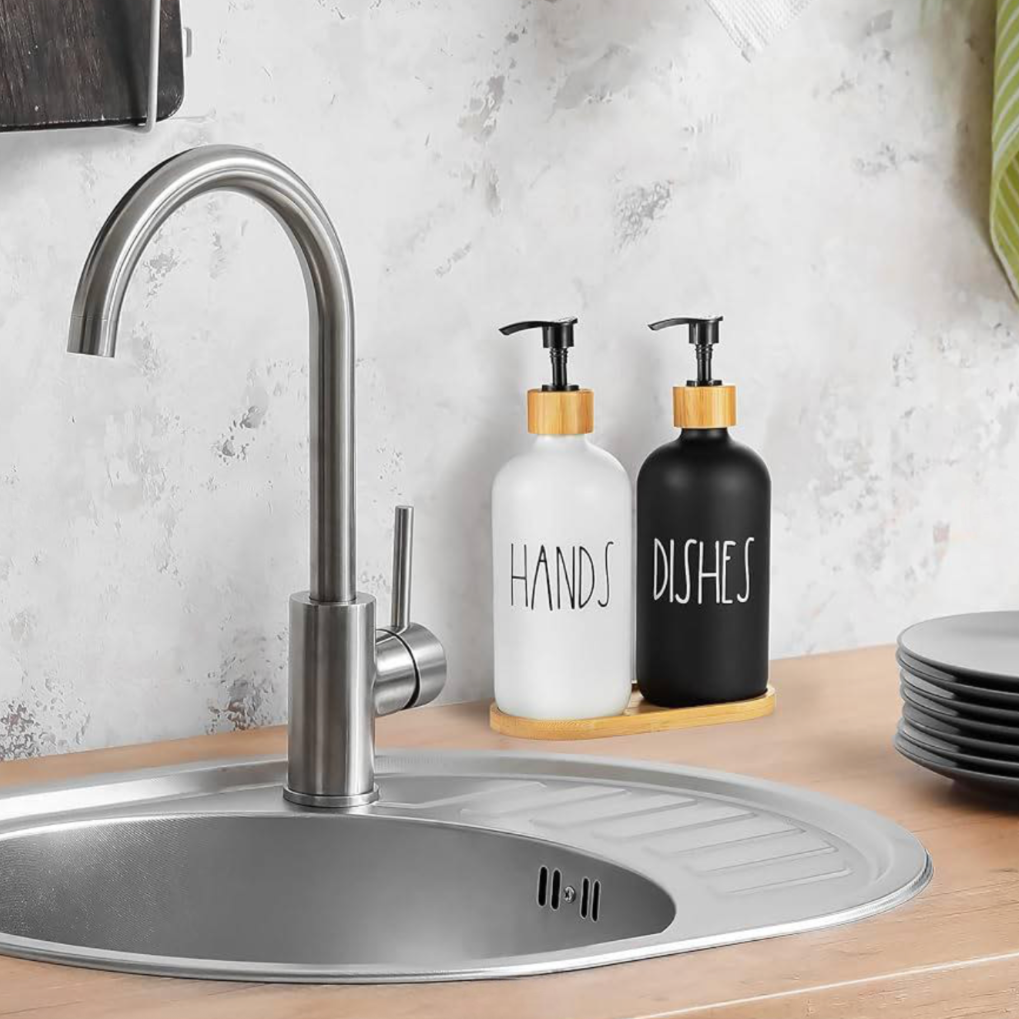 علبتين زجاج مع قاعدة خشب بامبو، وحدة لسابون الأيدين ووحدة للجلي، شكل مرتب وبضيف لمسة أنيقة عالـمجلى.