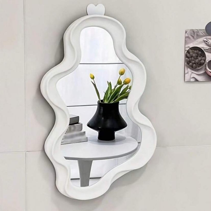 مرآة حائط بتصميم فريد وعصري. تتميز بإطارها السميك والمموج باللون الوردي، مما يضيف لمسة فنية وجمالية مميزة لأي غرفة. مناسبة لتزيين الجدران أو وضعها على الطاولات كقطعة ديكور فريدة