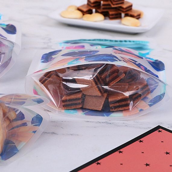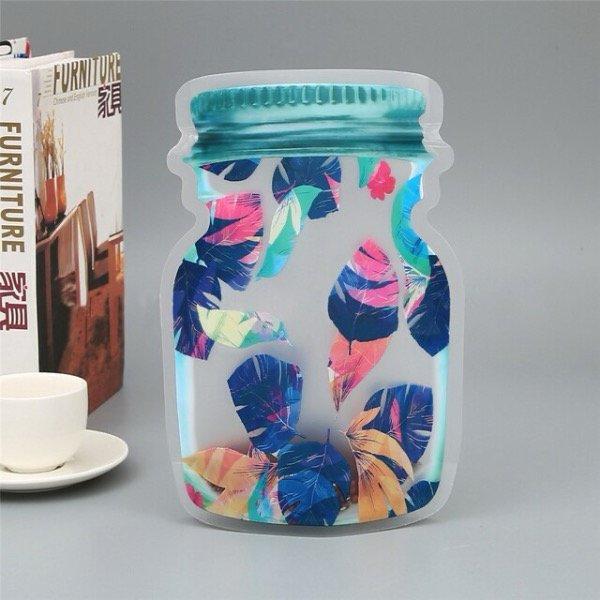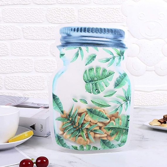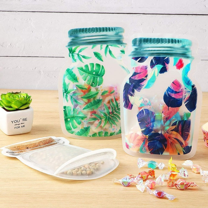 أكياس بلاستيكية قابلة لإعادة الغلق (بسوستة) مصممة بشكل إبداعي على هيئة برطمان. تتميز بنقشات أوراق شجر ملونة. تُستخدم لحفظ الأطعمة الجافة مثل المكسرات والحلويات، أو لتعبئة هدايا صغيرة، أو حتى كمنظمات للسفر.