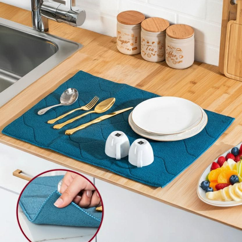 مفرش تجفيف أو حصيرة تجفيف تُستخدم لوضع الأواني والأكواب والأطباق بعد غسلها. يتميز المفرش بأنه مصنوع من قماش سميك وماص للماء، مما يجعله يمتص قطرات الماء الزائدة ويمنعها من التجمع على سطح رخامة المطبخ. هو حل عملي ونظيف لتجفيف الأواني بشكل طبيعي بدون الحاجة إلى صفاية الأطباق التقليدية.