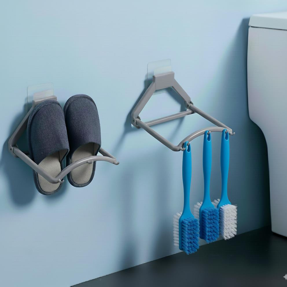 علاقة بلاستيكية تثبت على الحائط بلاصق، مش محتاجة مسامير أو تخريم. القطعة الأساسية بتستخدم لحمل سطل الغسيل القابل للطي، وكمان فيها خطافات تحت لتعليق الفرش. القطعة الثانية منفصلة وبشكل علاقة ملابس، وممكن تستخدم لتعليق أي أدوات تانية. المنتج ده عملي جداً لتنظيم المساحات الصغيرة، وبيحافظ على الأدوات جافة ومنظمة.