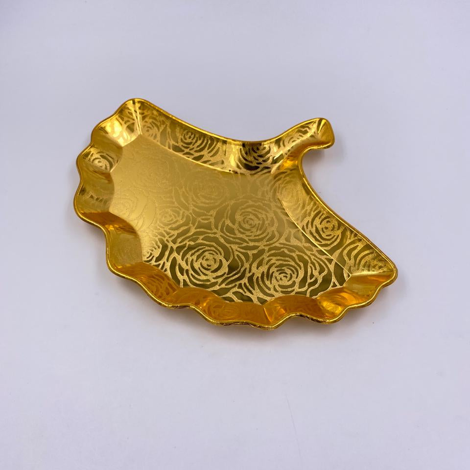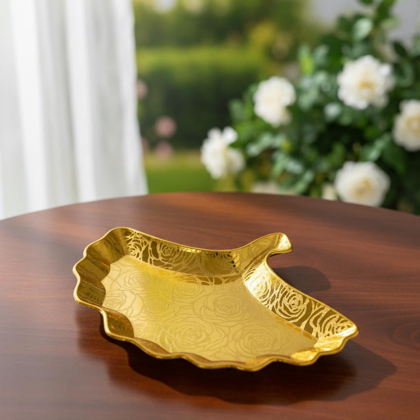صحن ديكور صغير أو صحن تقديم لونه ذهبي لامع، ومصمم بشكل مميز غير منتظم. النقشة البارزة على سطحه على شكل ورود متداخلة