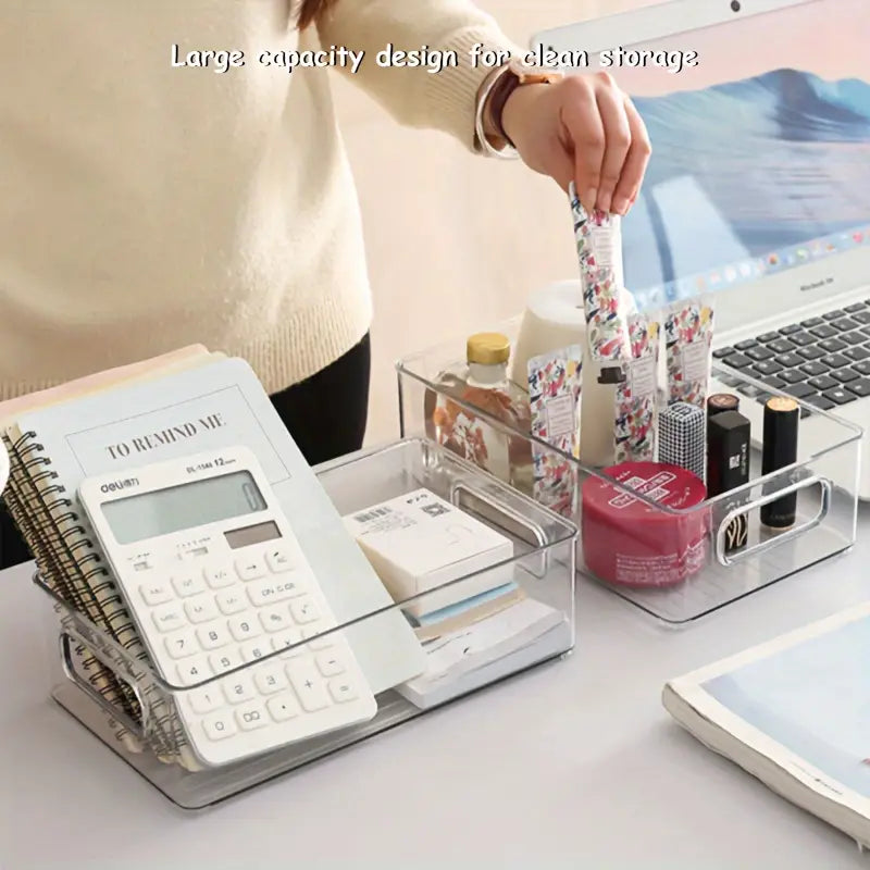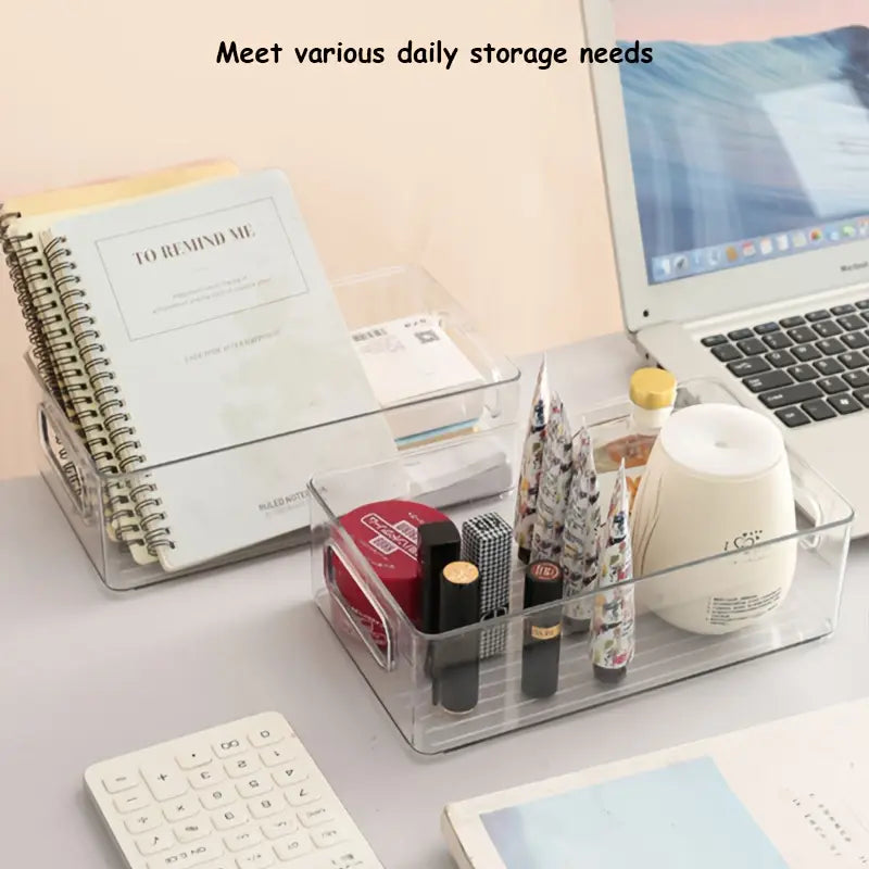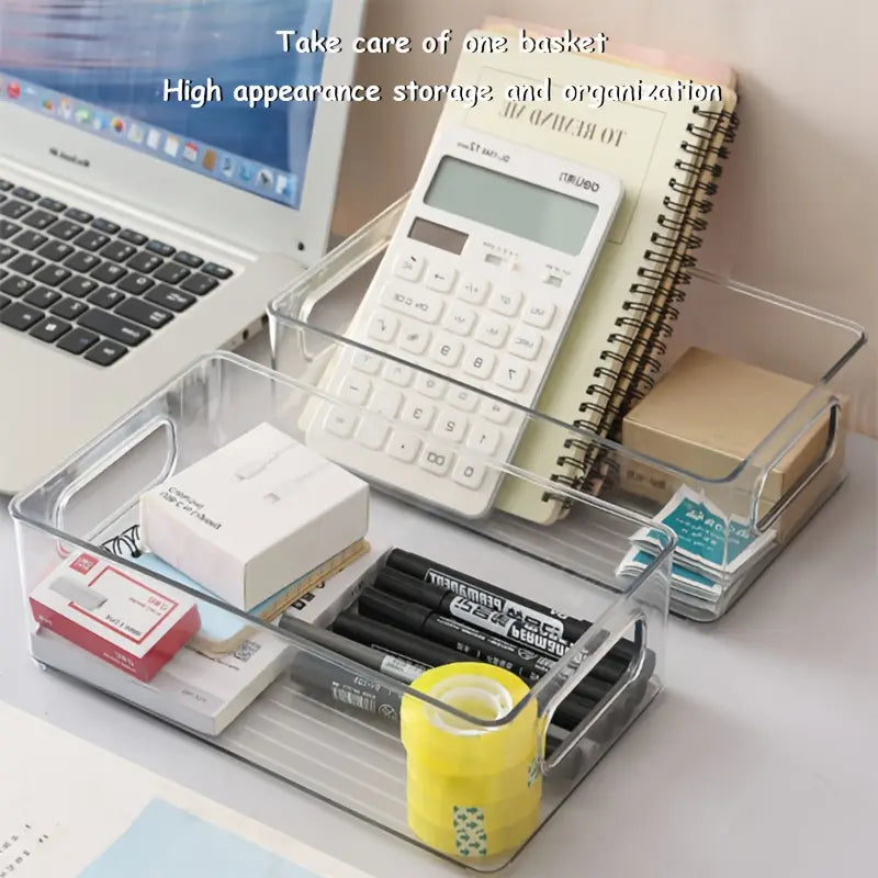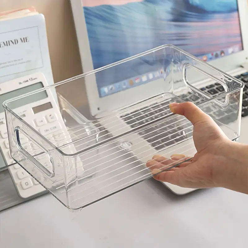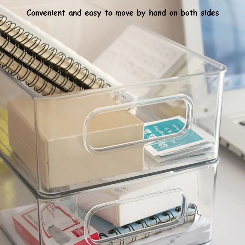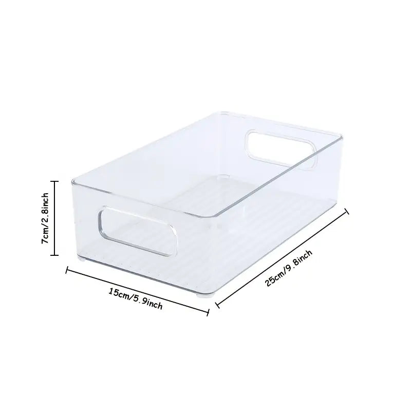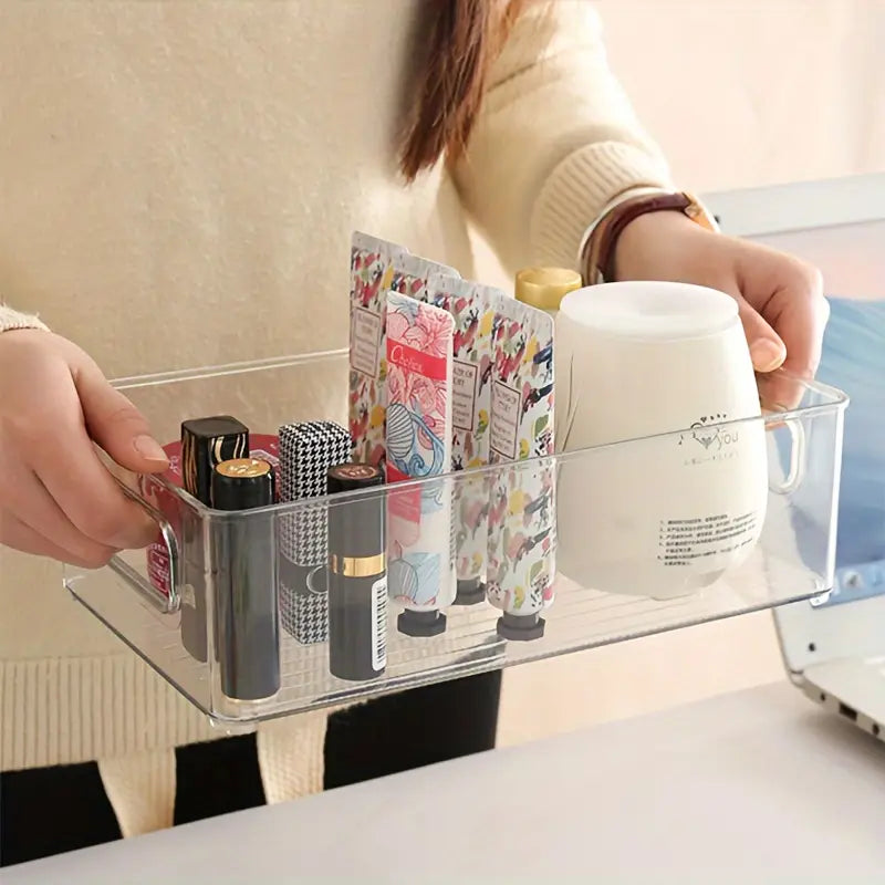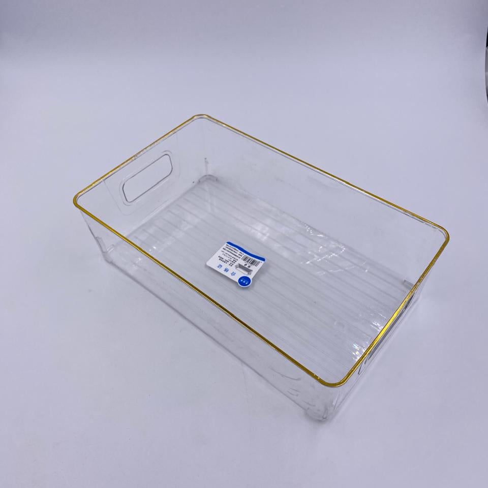 سلة تنظيم عملية وأنيقة مصنوعة من مادة الأكريليك الشفاف، مثالية لترتيب وتنسيق أغراضك في أي مكان بالبيت أو المكتب. تصميمها العصري يجمع بين الشفافية الكاملة التي تسمح لك برؤية المحتوى بسهولة، وحواف ذهبية رفيعة تضيف لمسة من الفخامة. تحتوي السلة على يدين جانبيتين لسهولة الحمل والنقل. يمكن استخدامها لتنظيم أدوات المكياج، مستلزمات المطبخ، أدوات المكتب، أو حتى أغراض الحمام