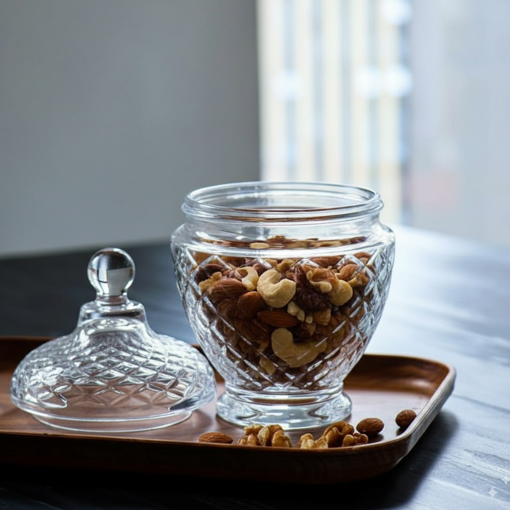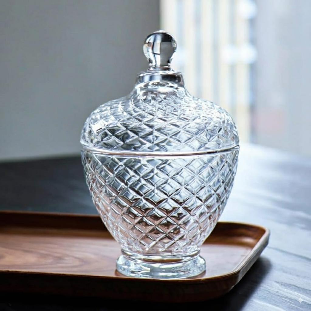 وعاء زجاجي فاخر ومزخرف، مثالي لتزيين أي مكان في البيت. تصميمه الأنيق والزخرفة الماسية بتخليه قطعة ديكور مميزة. تقدر تستخدمه عشان تحط فيه حلويات، شوكولاتة، مكسرات، تسالي