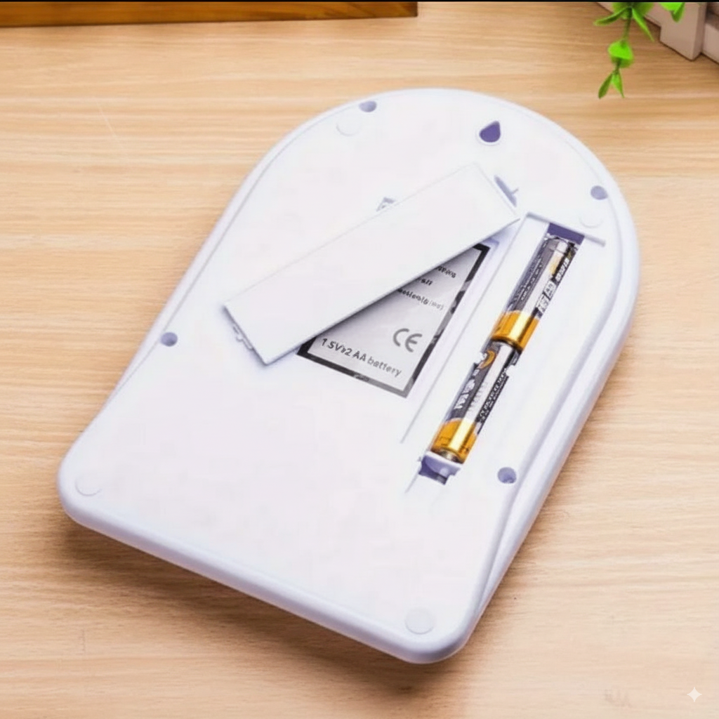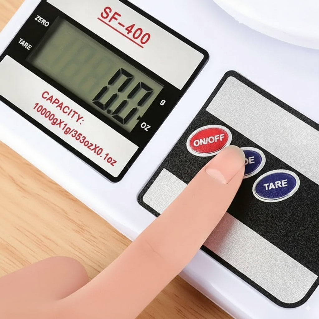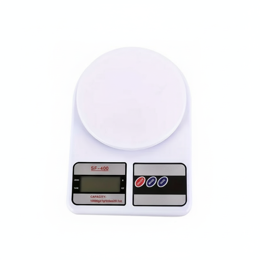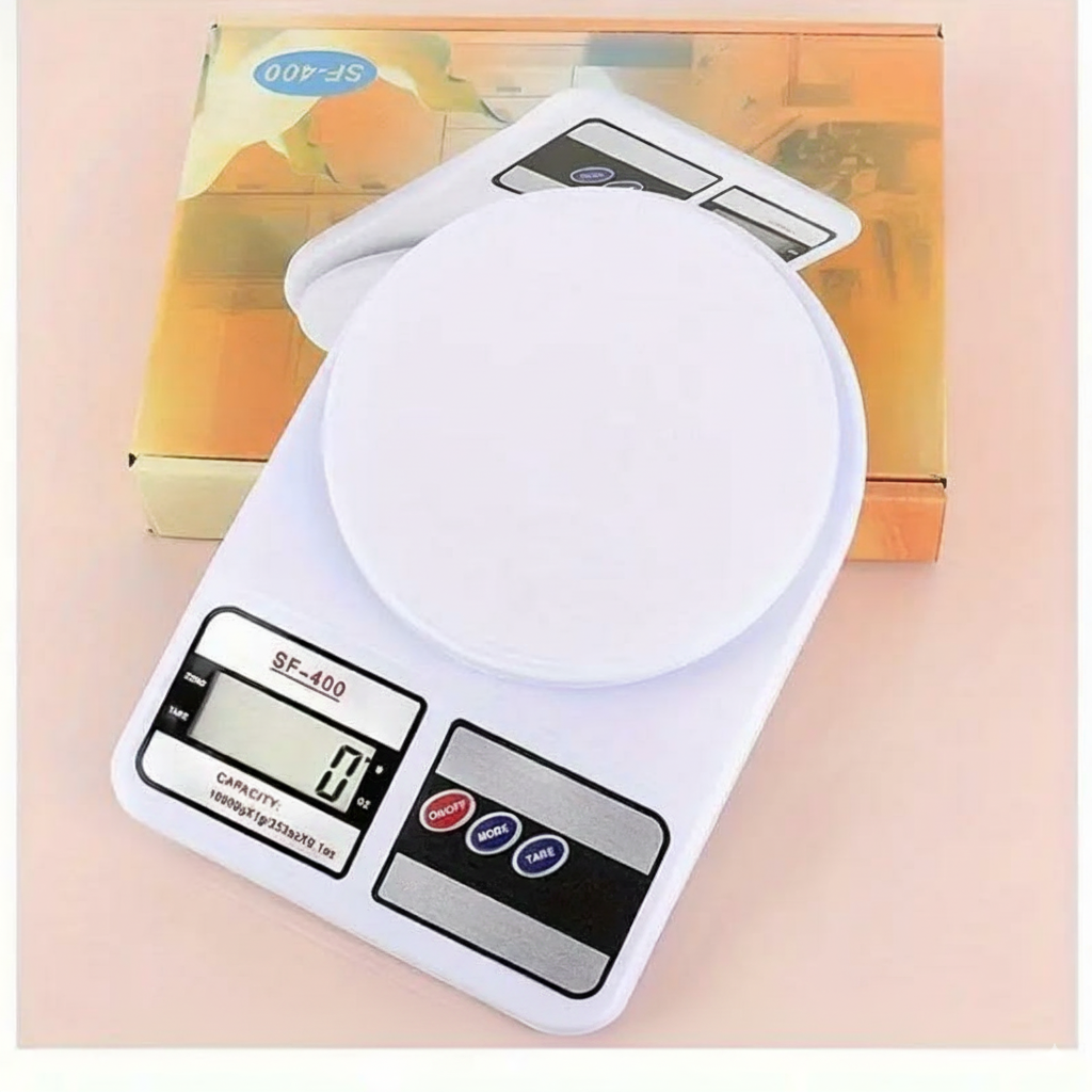 أداة أساسية في المطبخ لقياس كميات المكونات بدقة عالية، سواء كانت بالجرام، الكيلو جرام، أو الأونصة. يتميز بشاشة رقمية تسهل قراءة الوزن، ويحتوي على أزرار للتشغيل، تغيير وحدات القياس (mode)، وتصفير الوزن (tare) لوضع الأطباق أو الأوعية. يُستخدم لتحضير الوصفات التي تتطلب دقة في المقادير، مثل المخبوزات والحلويات.