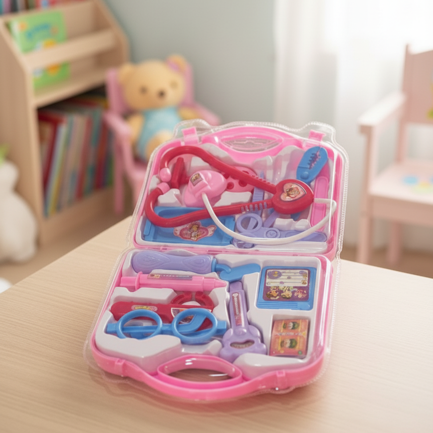 حقيبة لعب طبيب للأطفال تحتوي على جميع الأدوات اللي يحتاجها الدكتور الصغير، مثل السماعة، الإبره، الترمومتر، نظارات، ومقصات. تصميم آمن وخفيف مع ألوان جذابة مناسبة للبنات والأولاد. تشجع على اللعب التخيلي وتعلّم العناية بالآخرين بطريقة ممتعة.