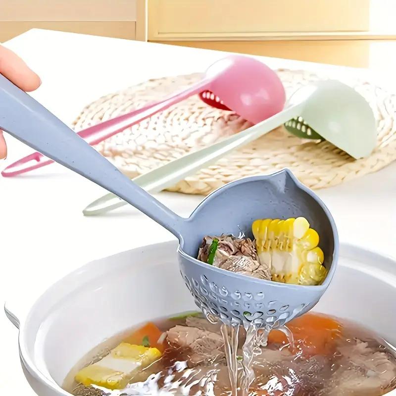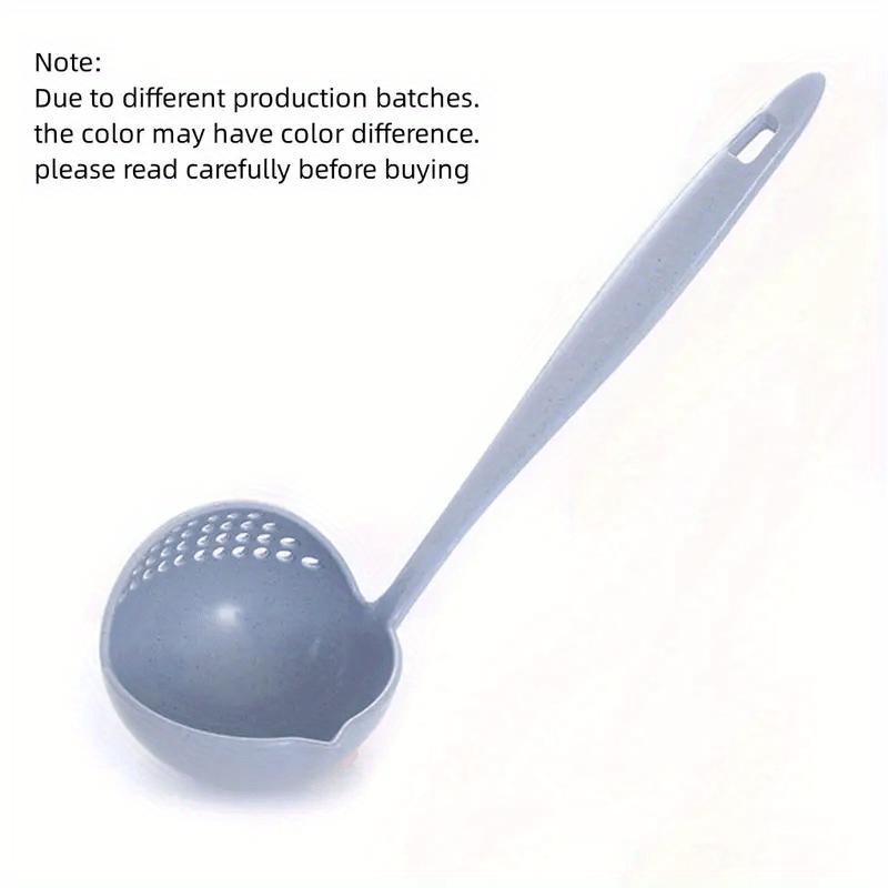 كفكير بلاستيك مصممة بذكاء لتكون أداة مطبخ مزدوجة الوظيفة. الجزء الرئيسي منها يعمل كمغرفة عميقة لغرف السوائل مثل الشوربة أو المرق، بينما يحتوي طرفها على جزء مصفاة مثقّب يسمح لك بتصفية السوائل أثناء الغرف.