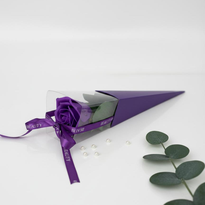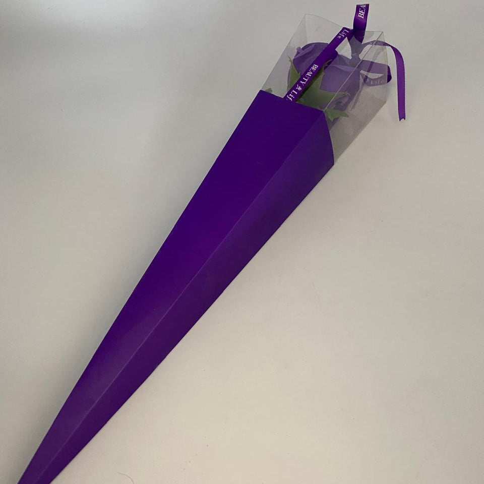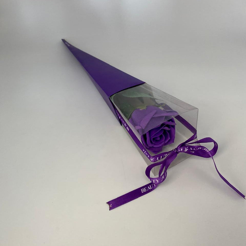 وردة واحدة (لونها بنفسجي غامق)، غالباً تكون صناعية (دائمة) أو صابونية معطرة، ومغلفة بطريقة أنيقة وجذابة عشان تكون هدية بسيطة وسريعة