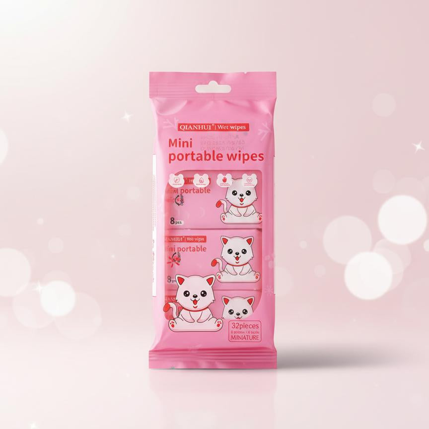 مناديل مبللة صغيرة ومحمولة، حجمها ميني عشان تكون سهلة الحمل والتحرك