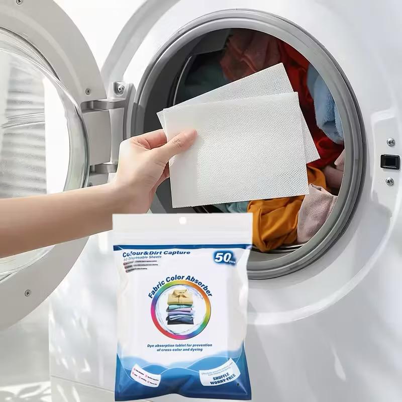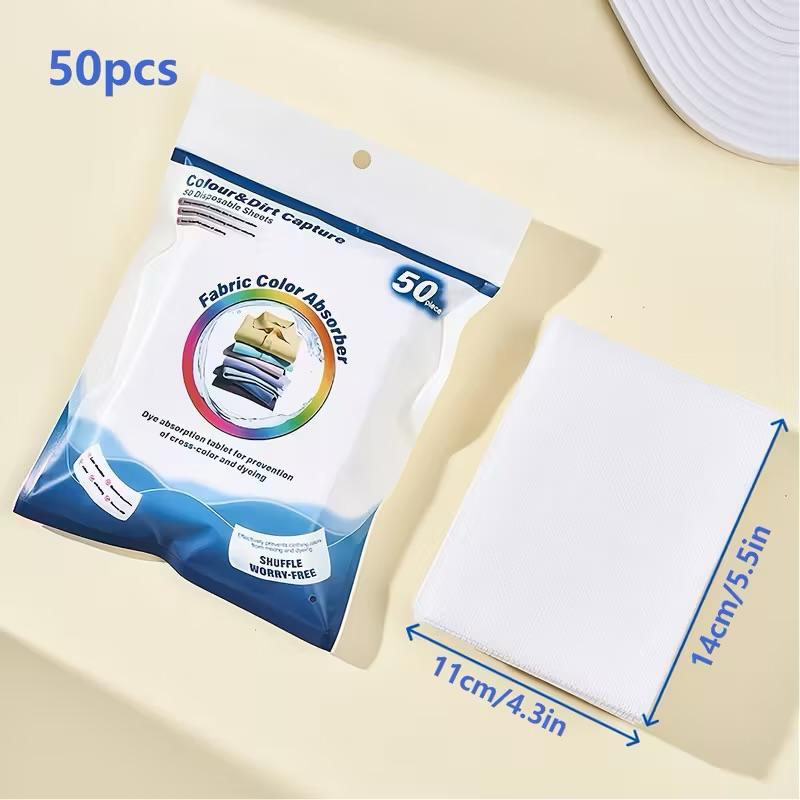 ورقة سحرية تحطها بالغسالة مع ملابسك. شغلها إنها تجمع وتمتص كل الألوان اللي بتطلع من الهدوم، خاصةً لو بتغسل ملابس ملونة مع بيضا أو ألوان غامقة وفاتحة مع بعض