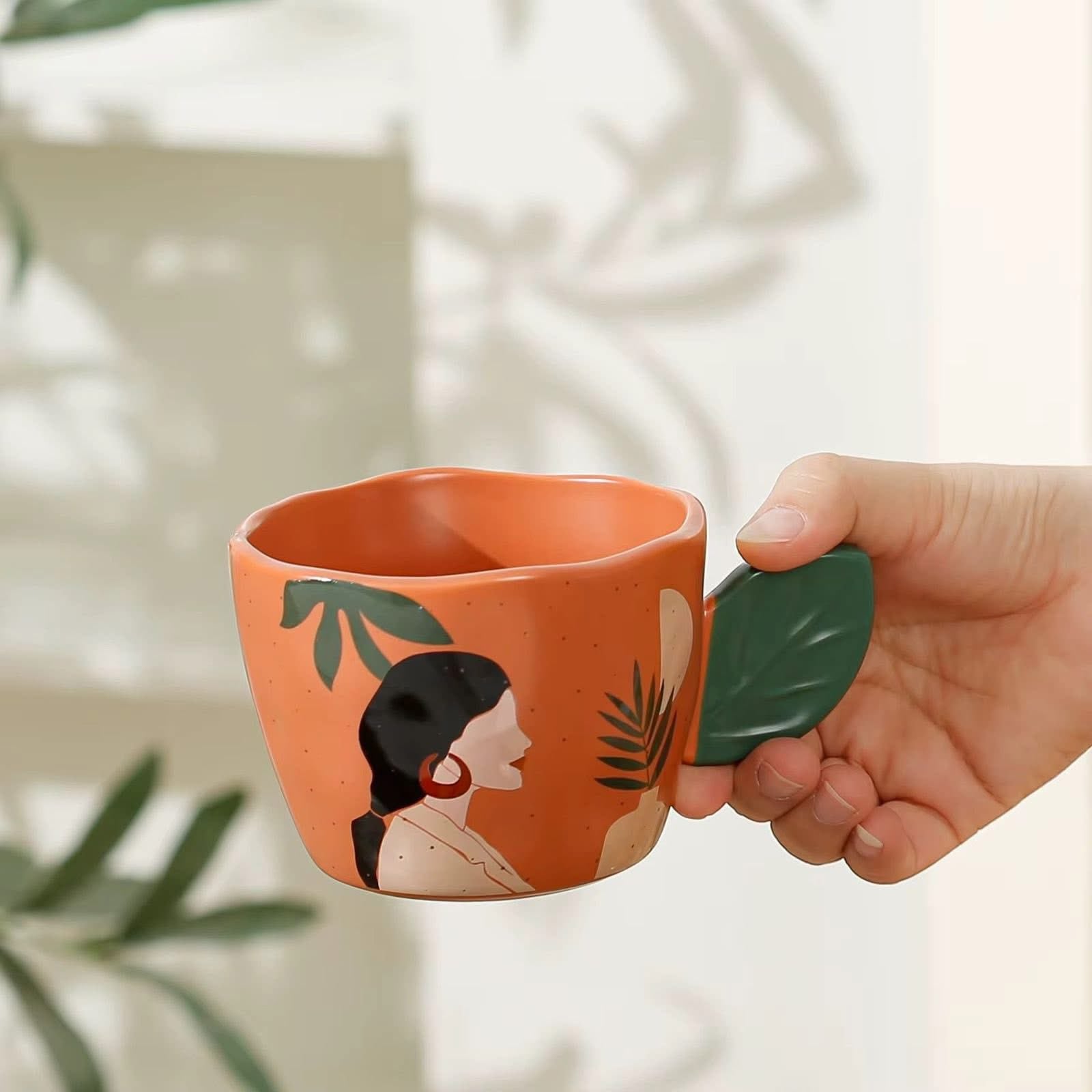 لونه برتقالي دافي، وعليه رسمة لبنت ستايل وورق شجر بيعطيك vibes هدوء وهيبة بنفس الوقت.