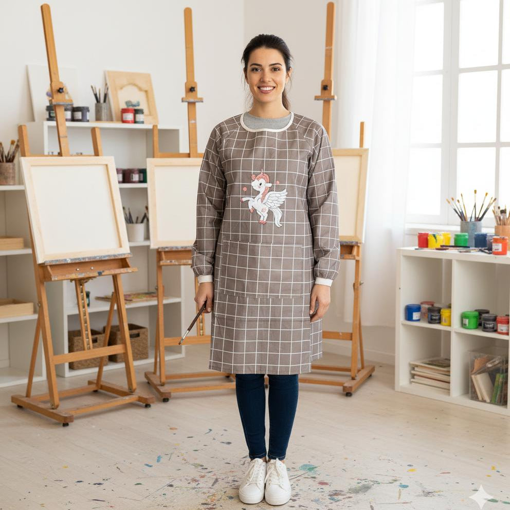هي مريول طويلة بأكمام، بتلبسها عشان تحمي ملابسك من البُقع أو الألوان أو الدهان لما تكون بترسم، بتطبخ، أو بتشتغل أي شغل فيه فوضى ضد الماء، ومغطية الجسم بالكامل تقريباً. المريلة اللي بالصورة