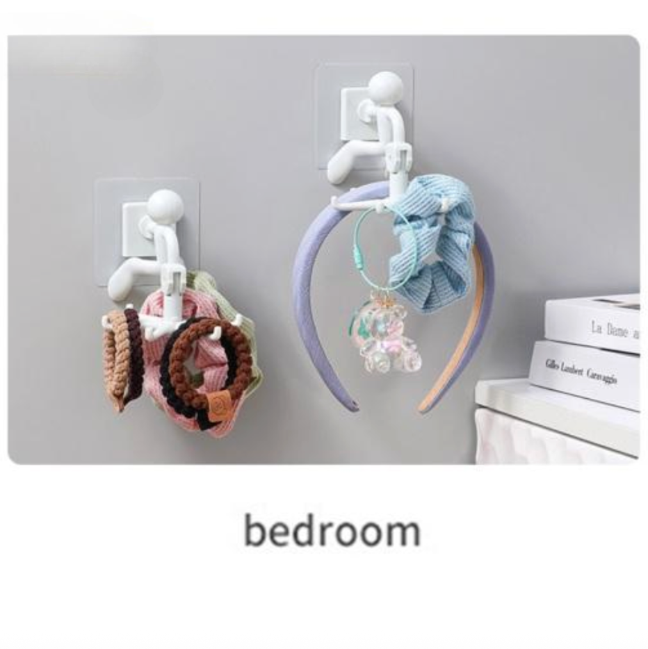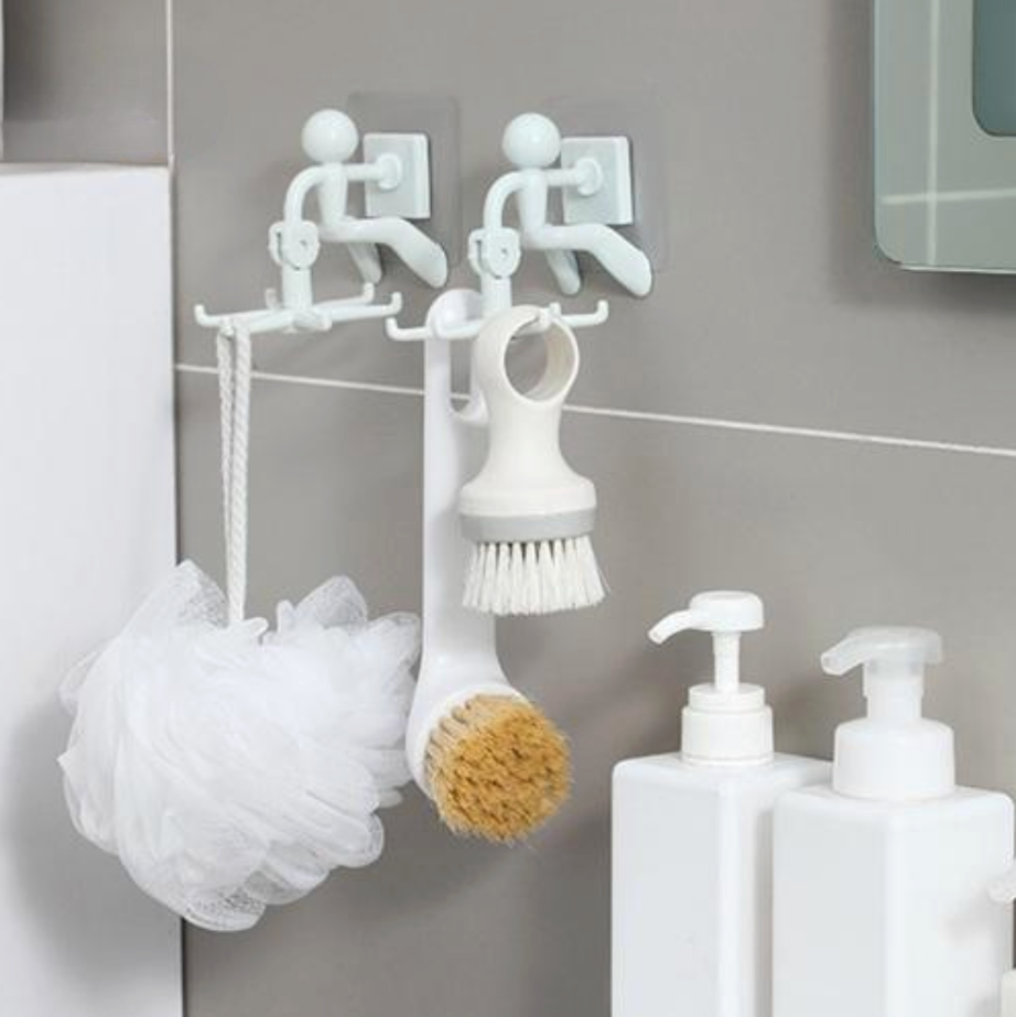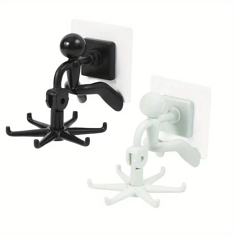 علّاقة بتلزق مباشرة على الحيط أو تحت الرفوف و ما بتحتاج مسامير عشان تثبّتها. الجزء اللي بتعلّق فيه الأشياء بيدور 360 درجة وعليه ٦ تعليقات ، عشان تقدر توصل للأدوات بسهولة. تصميمها جذاب ومختلف على شكل مجسم صغير (زي الرجل اللي جالس)