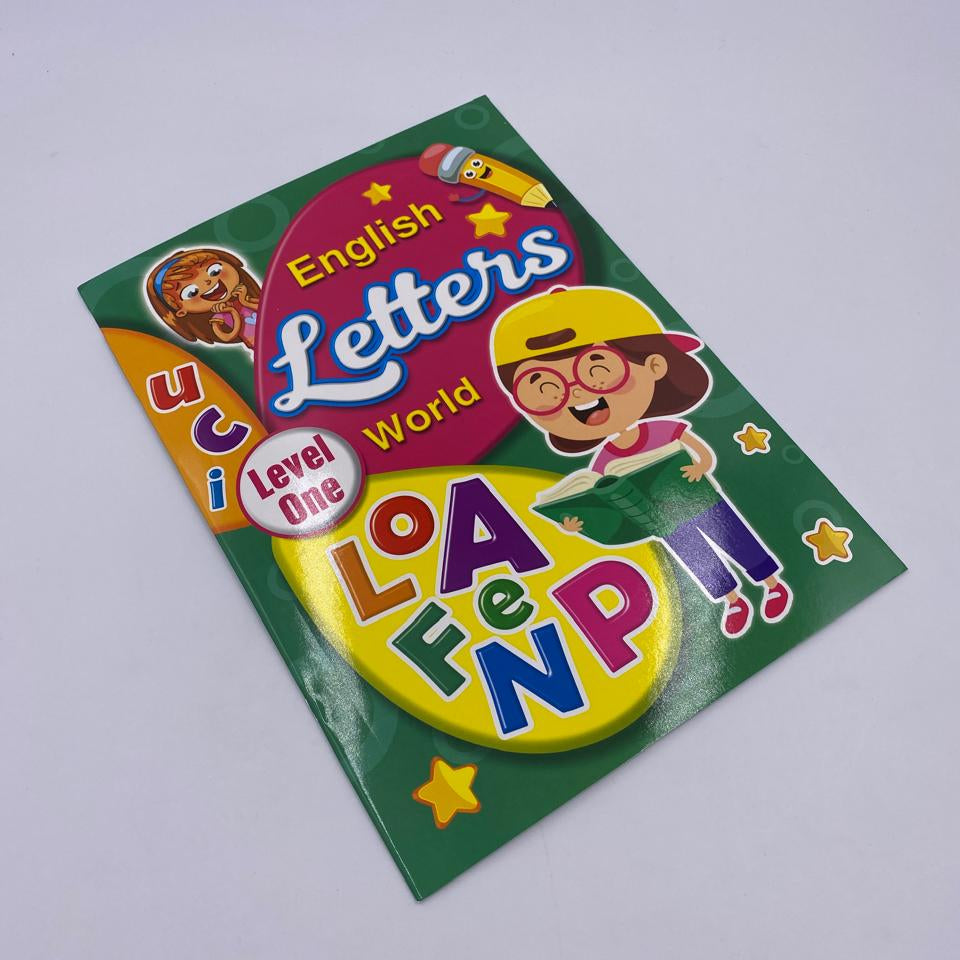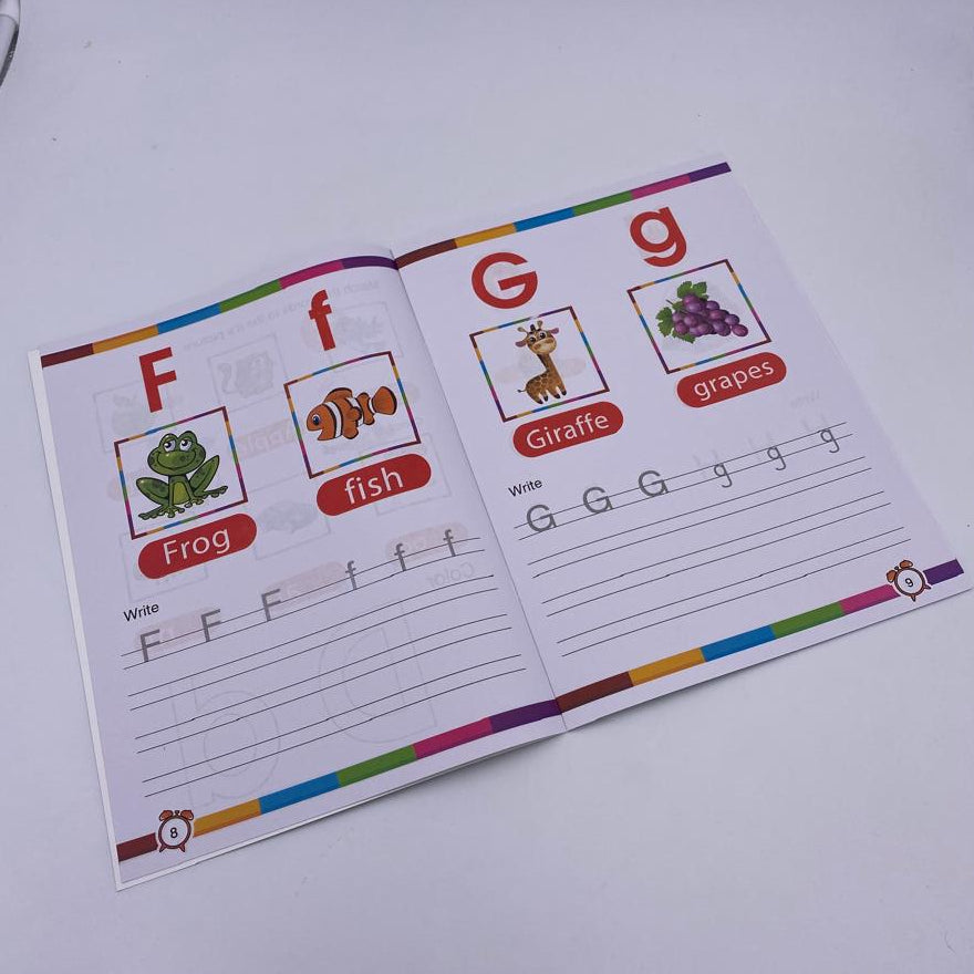 كتاب تعليمي أو دفتر تدريب حجمه كبير للأطفال المبتدئين عشان يتعلّموا حروف اللغة الإنجليزية والكلمات الأساسية. الكتاب فيه صور ملونة لكل حرف عشان تجذب الطفل، وفيه مساحات عشان يتدرب على كتابة الحروف الكبيرة والصغيرة ونسخ الكلمات. مناسب جداً لطلاب المستوى الأول