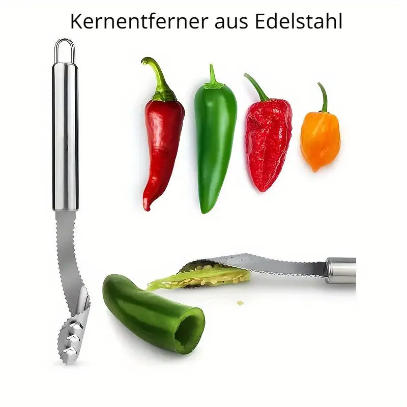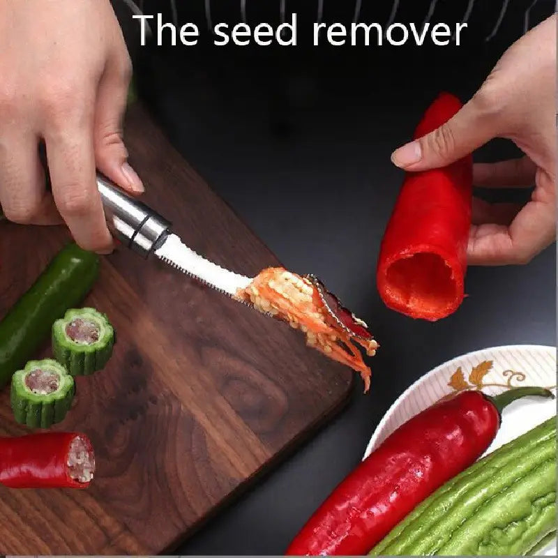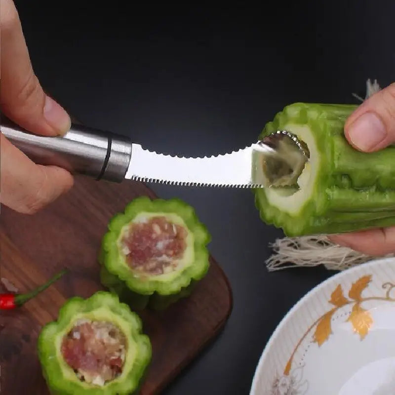 الجزء المسنّن (السكينة) بيساعدك تقطع رأس الكوسا والباذنجان وتجهّزه للتقوير، والجزء الثاني بيحفر لب الخضار بسرعة وبسهولة عشان يصير جاهز للحشي (المحشي).