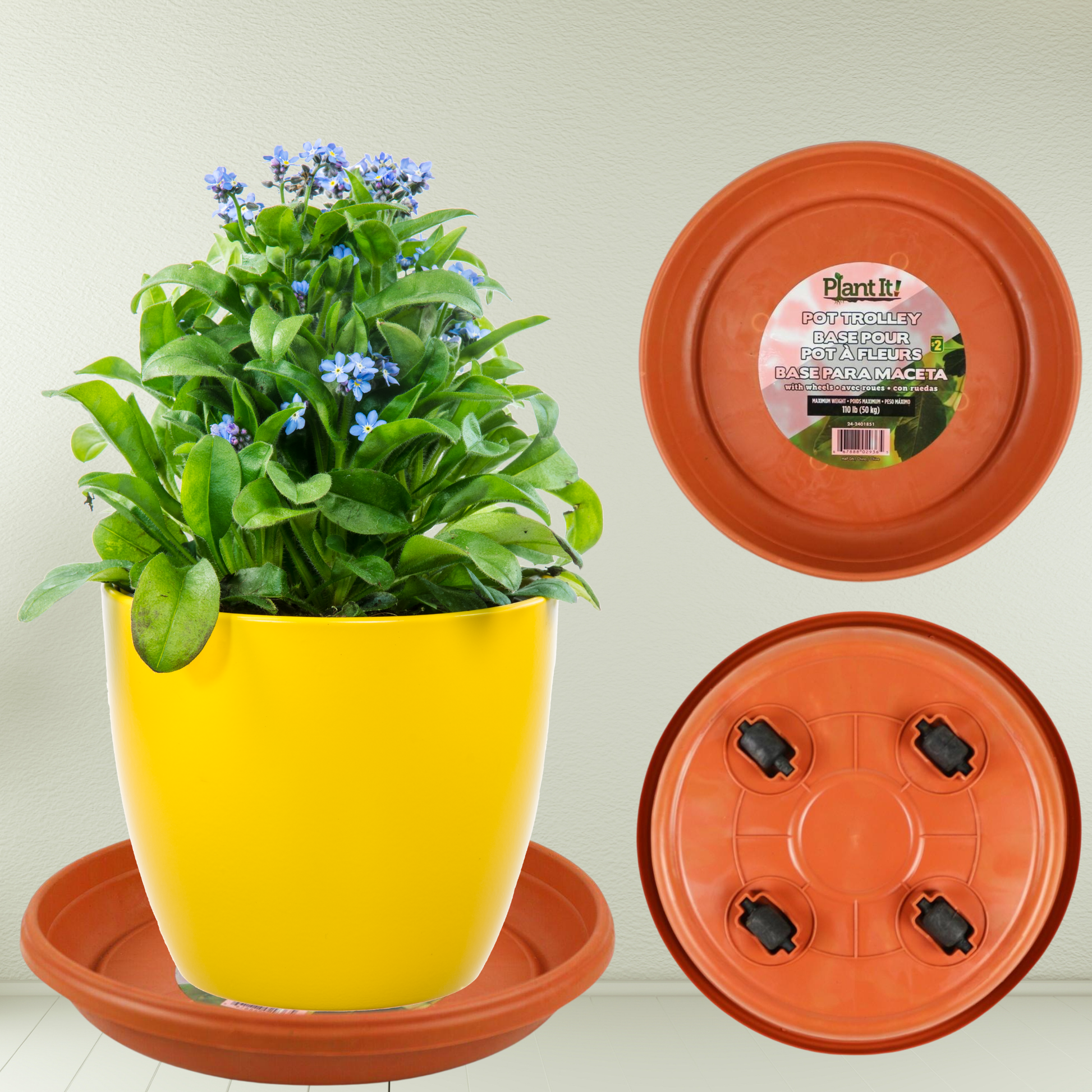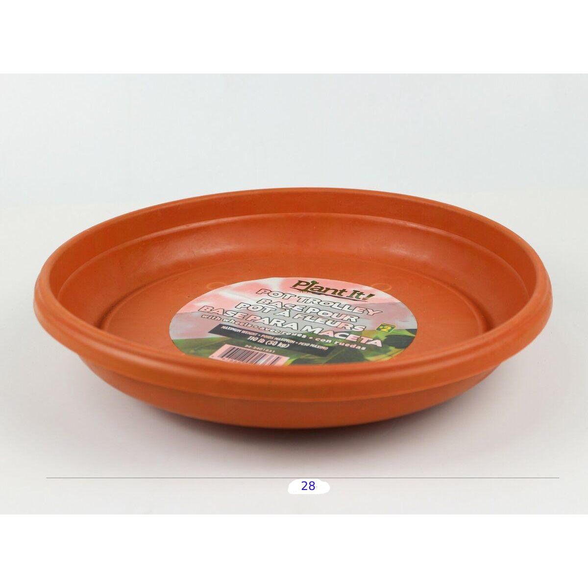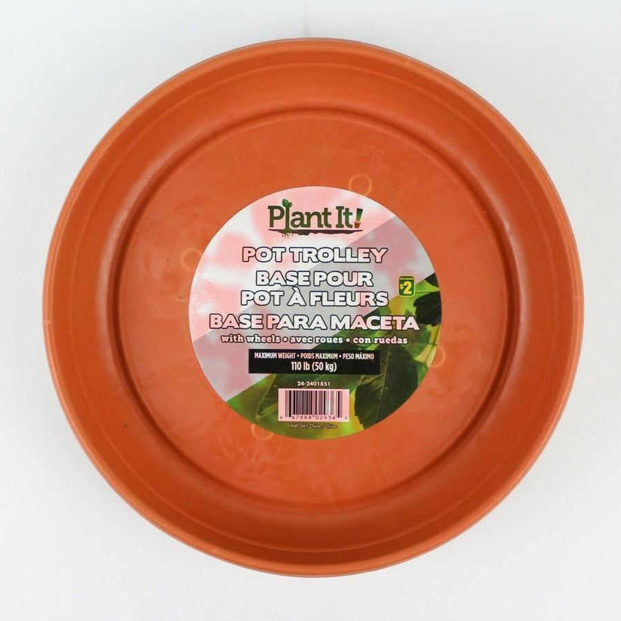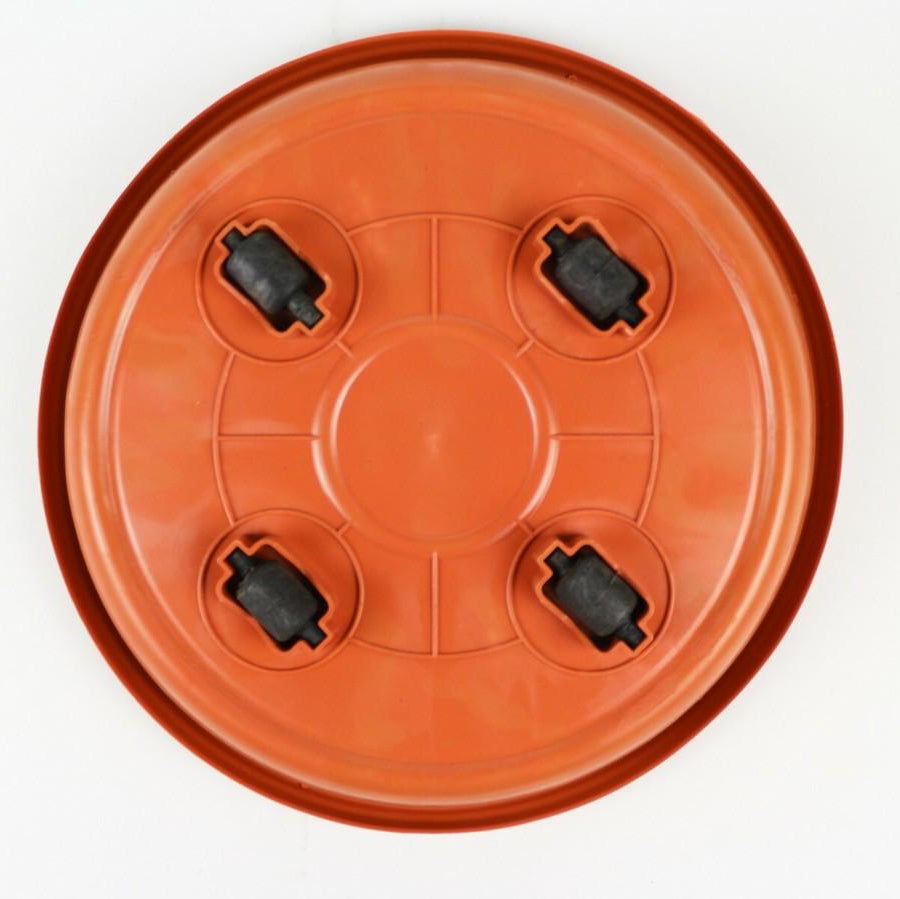 هذه القاعدة المتحركة هي الحل السحري لنقل النباتات الكبيرة والثقيلة داخل البيت أو في البلكونة. هي عبارة عن صحن بلاستيك متين (هنا بلون برتقالي/بني)، لكن في عجلات قوية تحت القاعدة (أربع كفرات) بتخليك تحرّك الأصيص بسهولة وبدون ما تخدش الأرض أو تتعب ظهرك