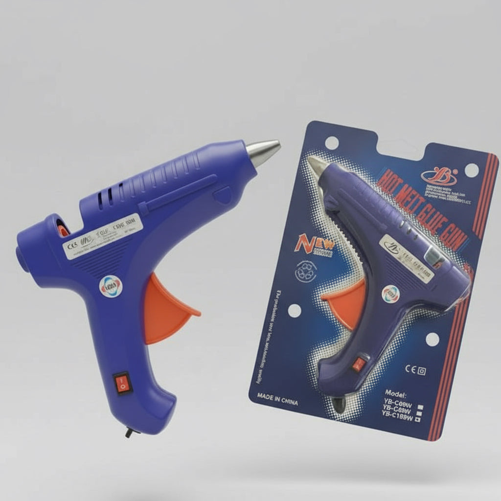 هذا المسدس الكهربائي بيستخدم لتثبيت ولصق أي شي يخطر على بالك بشكل سريع وقوي. طريقة عمله بسيطة: بتدخل عصا الشمع (الصمغ) من ورا، وبتشغله بالكهرباء (زي ما هو موضح في الصورة 100 فولت)، ولما يحمى، بتضغط على الزناد (المقبض) عشان يطلع الشمع السائل من قدام.