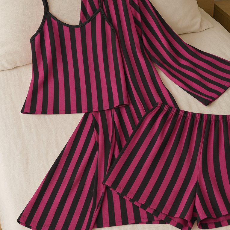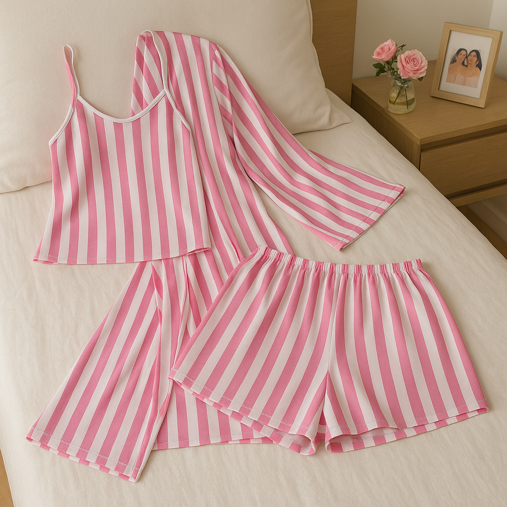 طقم بيجامة شيفون ناعم مكوّن من ثلاث قطع بخطوط أنيقة 😍 خفيف ومريح، بيعطي لوك مرتب وناعم بالبيت ✨
