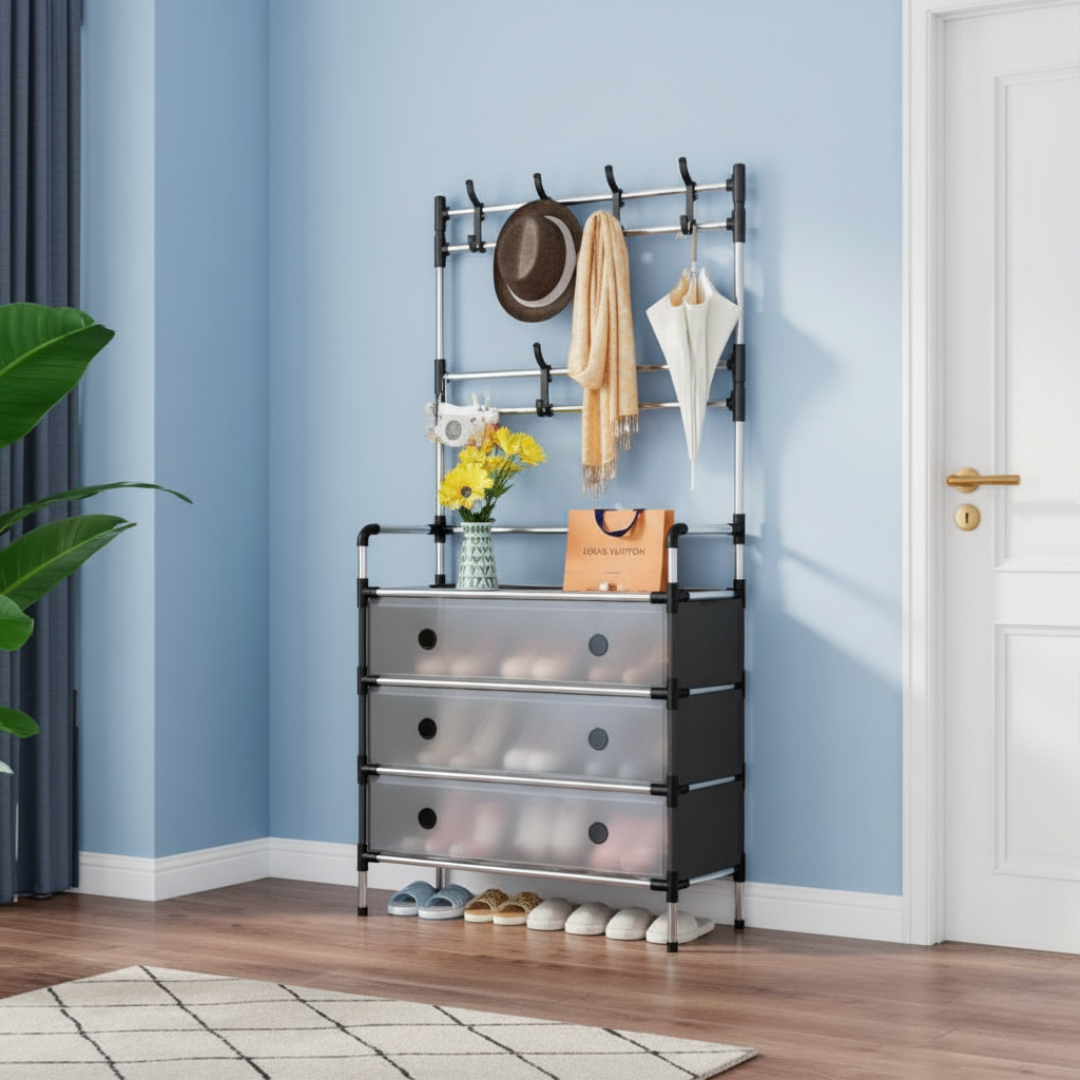 منظم أحذية وعلاقة ملابس متعدد الوظائف، مثالي للمداخل والردهات. يتميز بثلاث أدراج/خزائن واسعة ومغلقة شفافة جزئياً لتخزين الأحذية وحمايتها من الغبار، بالإضافة إلى رف علوي لحمل الأغراض. يحتوي الجزء العلوي على حامل معدني مزود بعدة خطافات لتعليق المعاطف، القبعات، الأوشحة والمظلات. تصميم عملي وموفر للمساحة يجمع بين التخزين والتعليق في قطعة واحدة، مما يساعد في الحفاظ على مدخل منزلك مرتباً ومنظماً