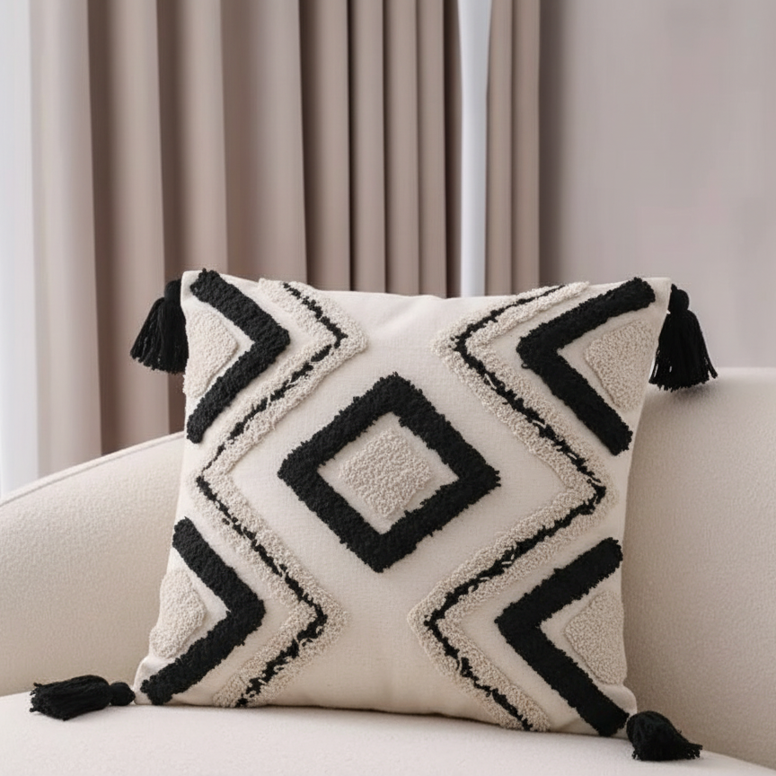هالمخدة تعطي لمسة فخمة ومرتبة لأي زاوية في البيت 👌. لونها أبيض بنقوش سوداء على شكل خطوط هندسية، ومعها شراشيب في الأطراف تعطيها شكل أنيق وعصري. تناسب الكنبة أو السرير، وتضيف جو دافئ وراقي للمكان 💫