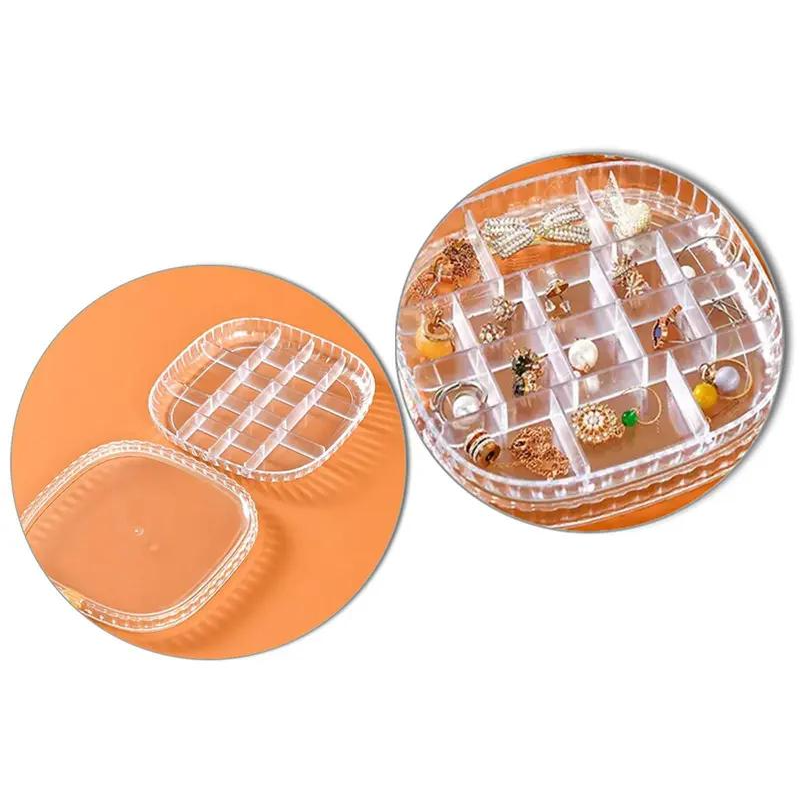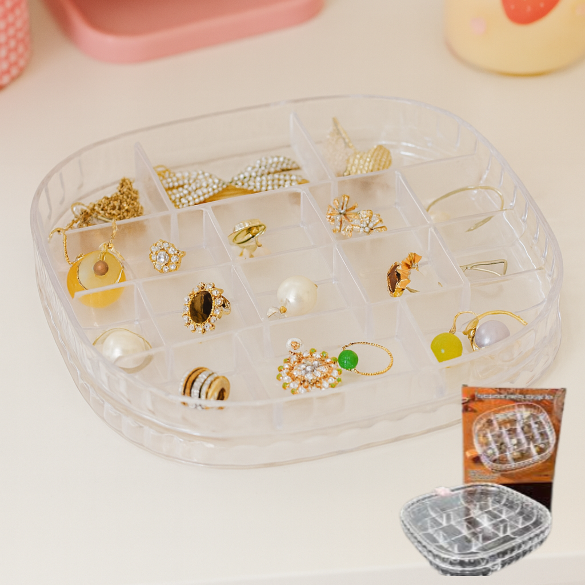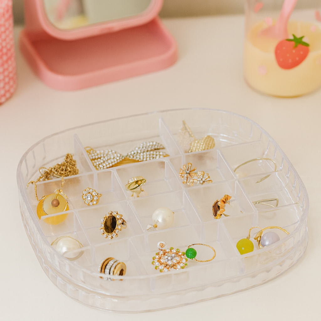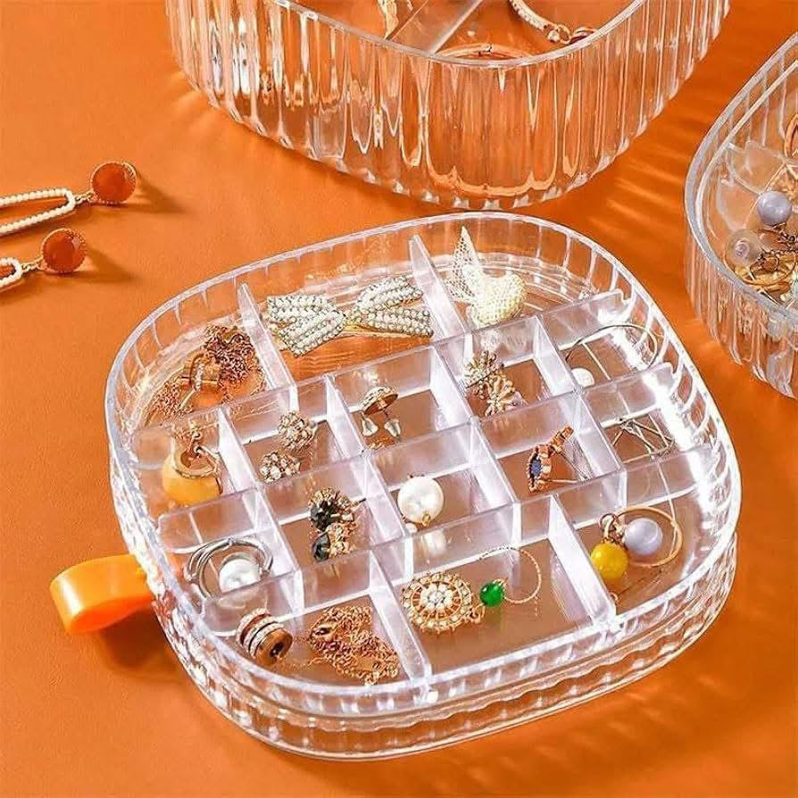 علبة أنيقة وشفافة بتقسيمات متعددة، تقدرين ترتبين فيها خواتمك، سلاسل، أقراط، وكل اكسسواراتك الصغيرة. طبقة وحدة لكن عملية جدًا وسهلة الاستخدام، تقدرين توصلين لأغراضك بسرعة بدون تعب