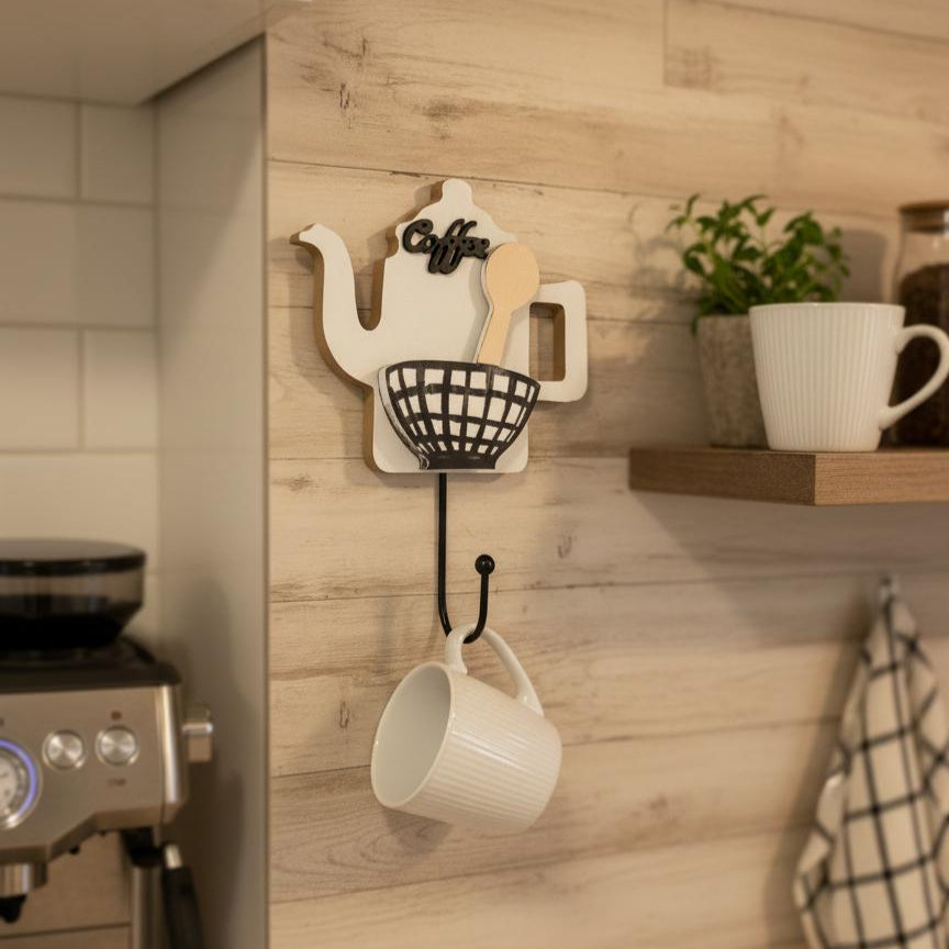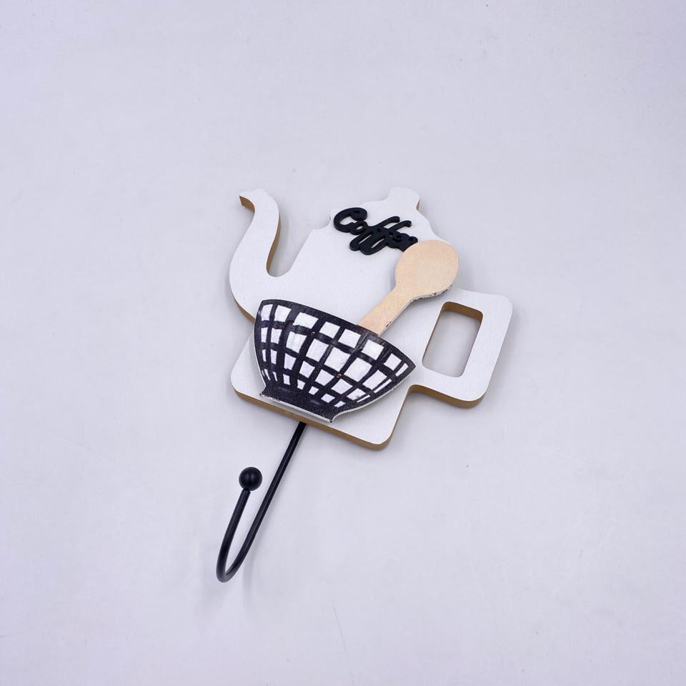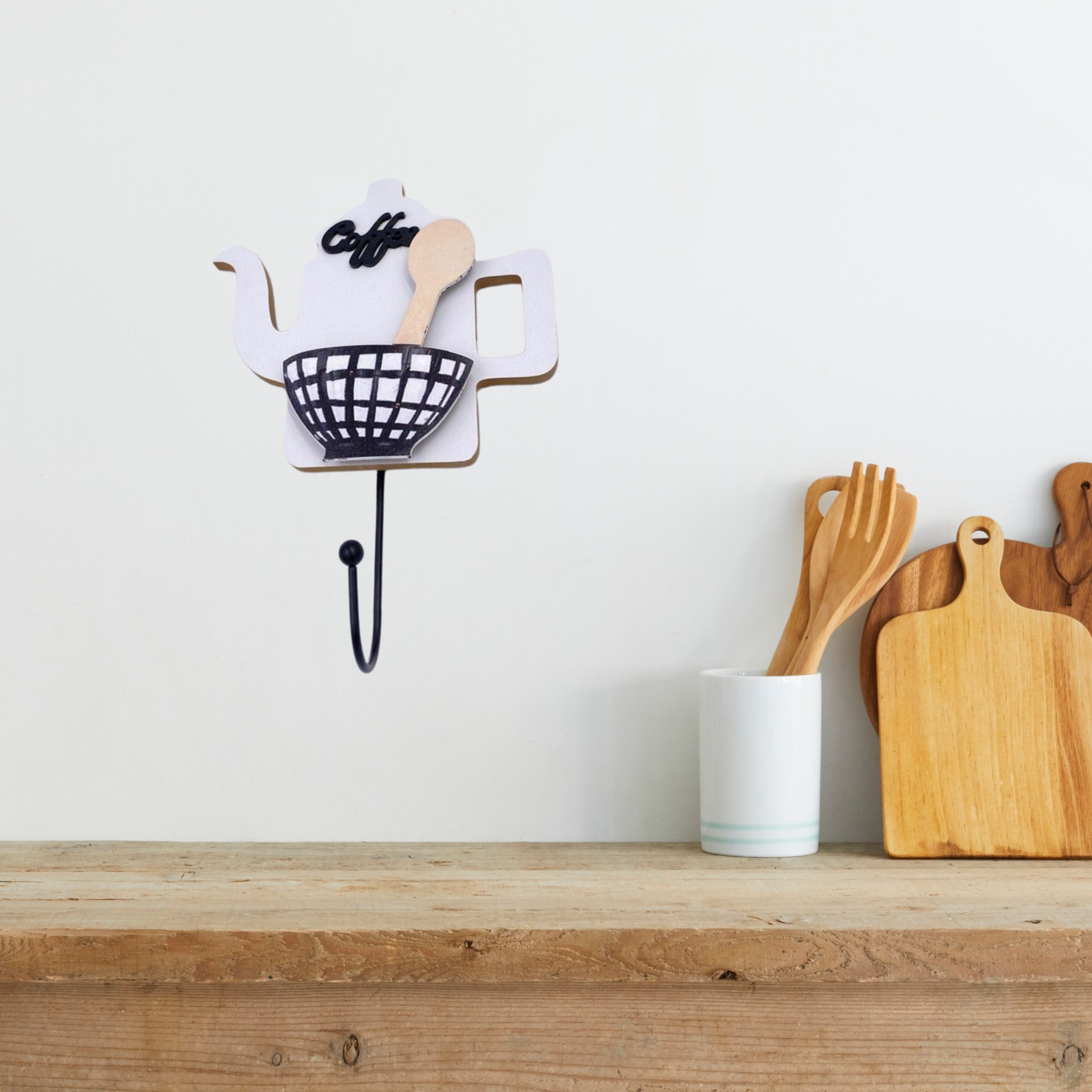 علاقة حائط شكلها مميز وحلو، جاية على شكل إبريق أبيض كبير وعليه كلمة "Coffee" بخط أسود أنيق.