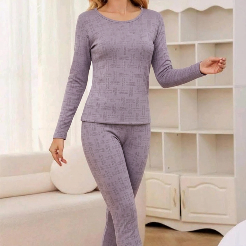 حافظي على دفئك وراحتك في الأيام الباردة مع طقم البيجامة الحرارية المبطنة هذا. صُمم هذا الطقم المكون من تيشيرت بأكمام طويلة وبنطلون ليمنحك شعورًا بالدفء الفائق والراحة القصوى، سواء كنتِ تسترخين في المنزل أو تحتاجين إلى طبقة إضافية تحت ملابسك الشتوية.