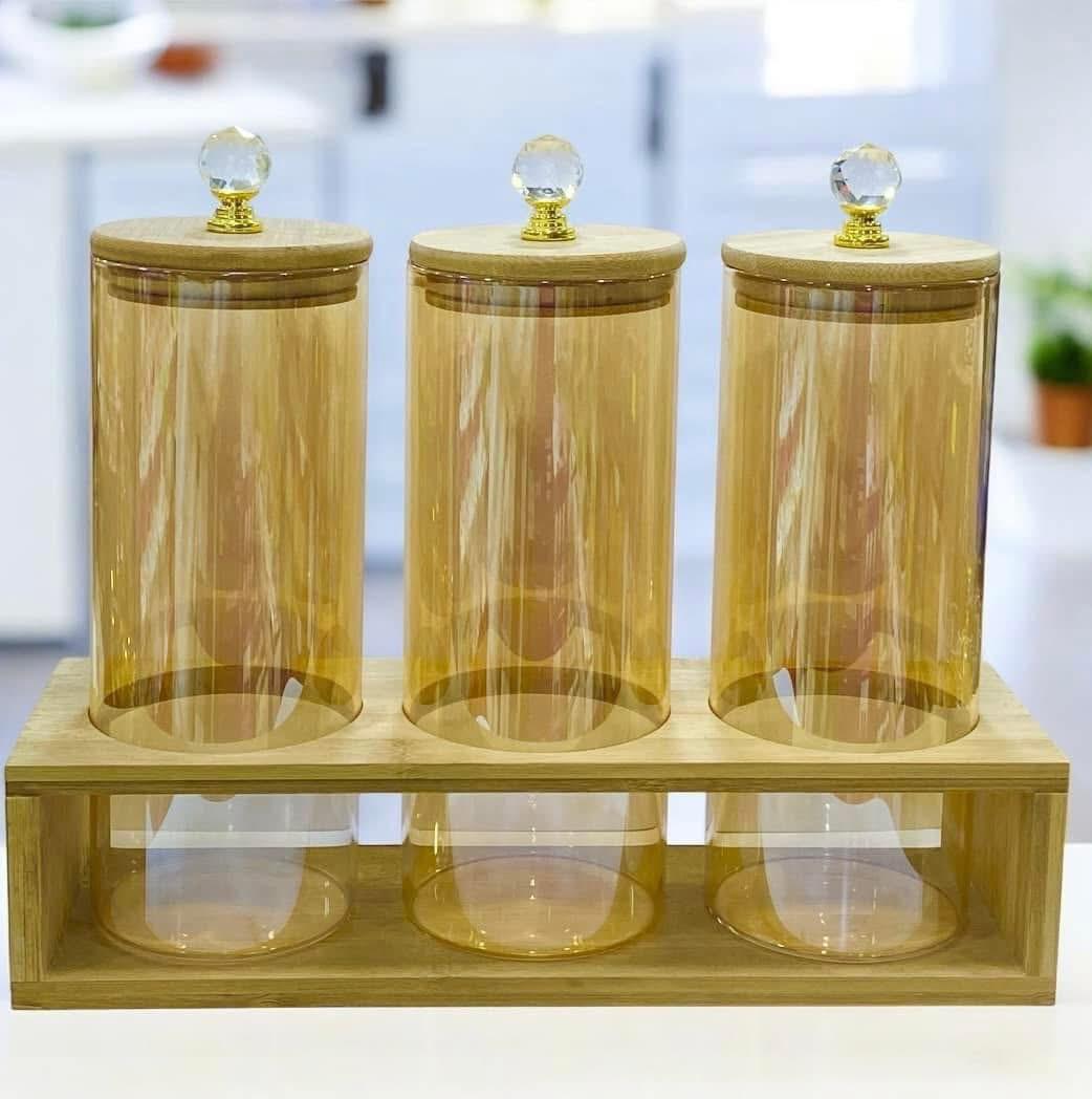 طقم تخزين مرتب المطبخ. من زجاج لونه عسلي ، شكلهم حلو وفخم. كل برطمان له غطاء من خشب ، وفوق الغطا فيه مسكة كريستال صغيرة شفافة ، تعطي شكل راقي.