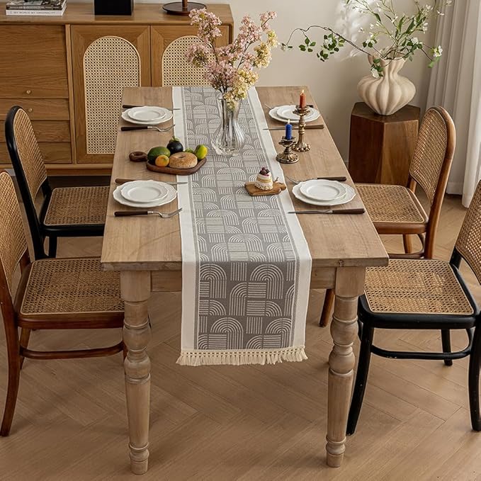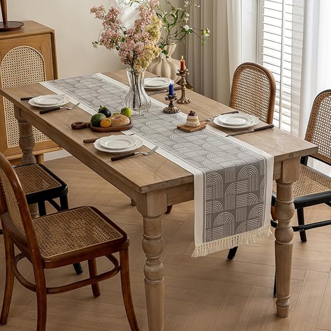 مفرش طاولة بنمط أنيق، بلونه السكني والأبيض وخطوطه المرتّبة، بضيف لمسة دفا وشياكة لأي زاوية بالبيت. طوله مناسب للطاولات الكبيرة ، ومزيّن بشرّابات عالطرفين بتعطيه طابع تقليدي ولمسة مودرن بنفس الوقت.