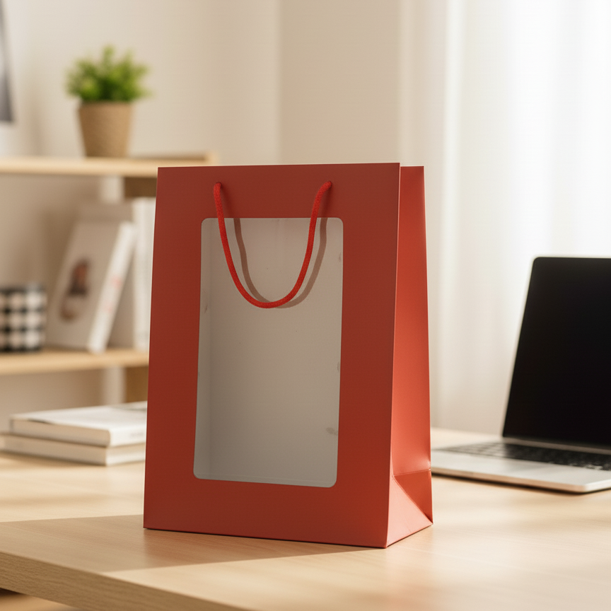 كيس ورق . فيه فتحة شفافة من قدام على شكل مستطيل، بتخليك تشوف الهدية أو المنتج اللي جوا الكيس، وله إيدين حبل لونها أحمر عشان يسهل مسكه وحمله. مناسب جداً لتغليف الهدايا