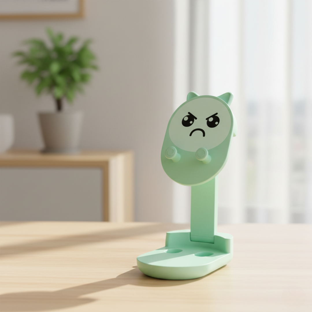 ستاند موبايل لطيف، لونه أخضر فاتح وعليه وجه كرتوني معصب شوي، بتخليه مميز وشكله حلو على المكتب أو الطاولة. بتقدر تثبت عليه تلفونك عشان تحضر فيديوهات، تعمل مكالمات فيديو، أو حتى للشغل براحة إيديك. هو قابل للطي، يعني بتقدر تسكره وتاخده معك وين ما رحت، وممكن تعدل زاوية الموبايل عشان تشوف الشاشة بأريح وضع إلك."