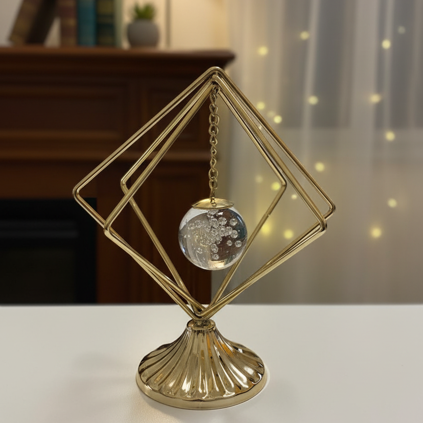 قطعة ديكور أنيقة وفخمة، عبارة عن كرة كريستالية شفافة معلقة بسلسلة ذهبية متداخلين، وكلها مثبتة على قاعدة ذهبية مزخرفة. بتعطي لمسة راقية وجميلة لأي مكان بتنحط فيه، زي المكتب أو الرف.