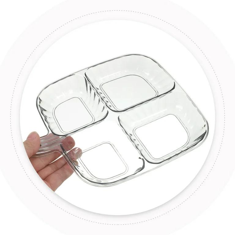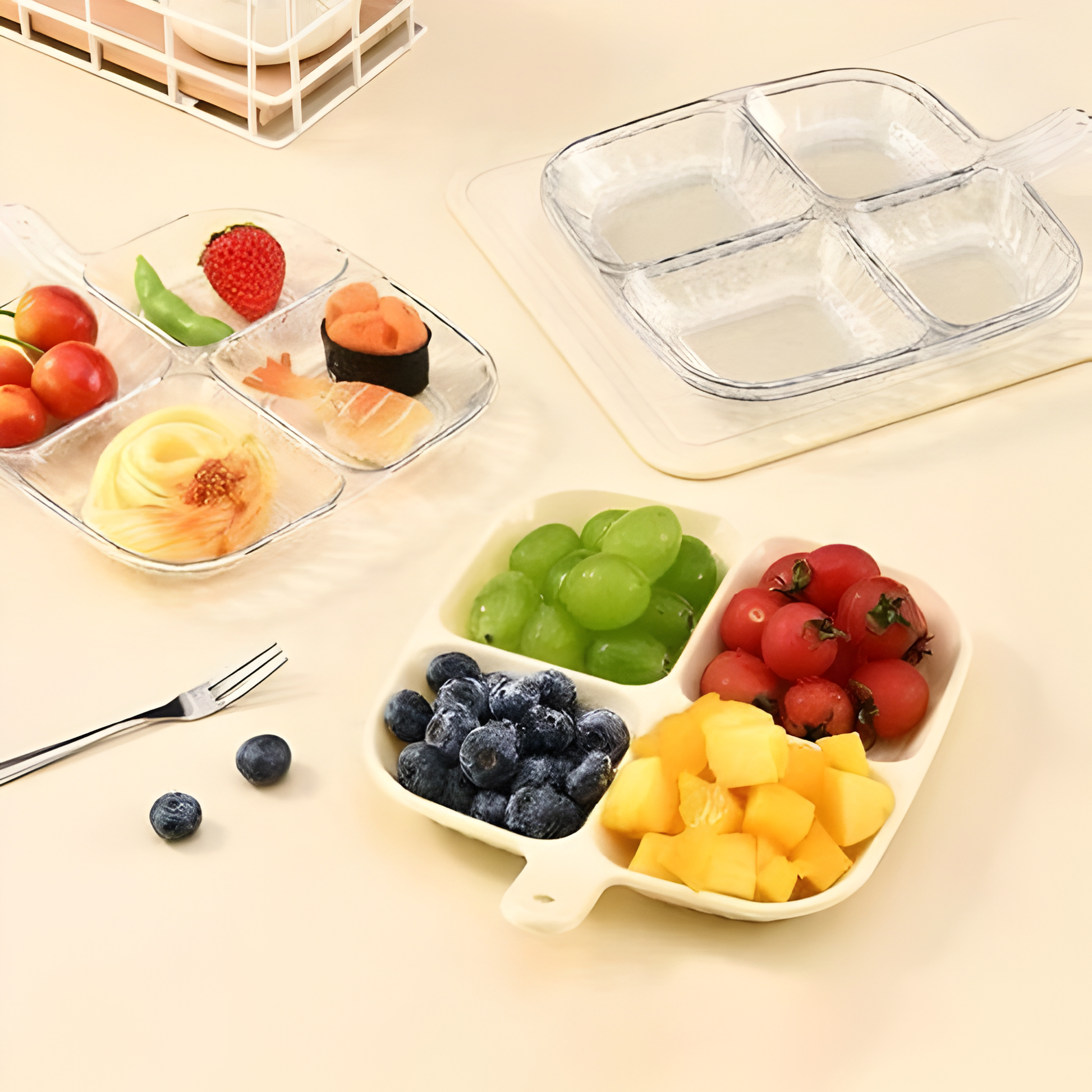 طبق تقديم مقسمة لأربع خانات. تصميمها عملي كثير عشان تقدم فيها أنواع مختلفة من الفواكه، المكسرات، المقبلات، أو حتى السوشي، من غير ما تختلط الأكل ببعضه. فيها زي إيد صغيرة عشان سهولة الحمل. شكلها أنيق ومناسبة للضيافة أو الاستخدام اليومي