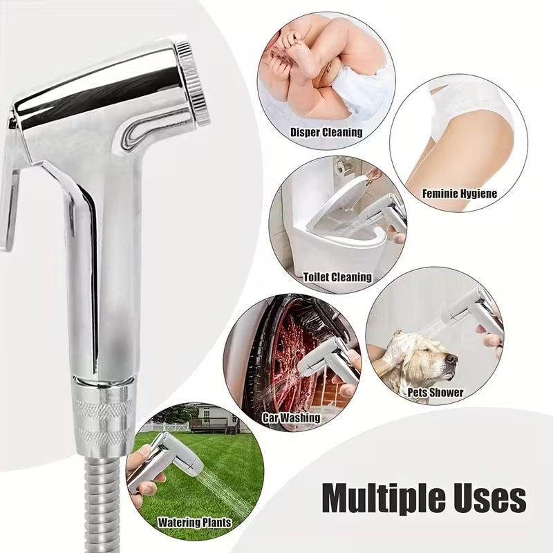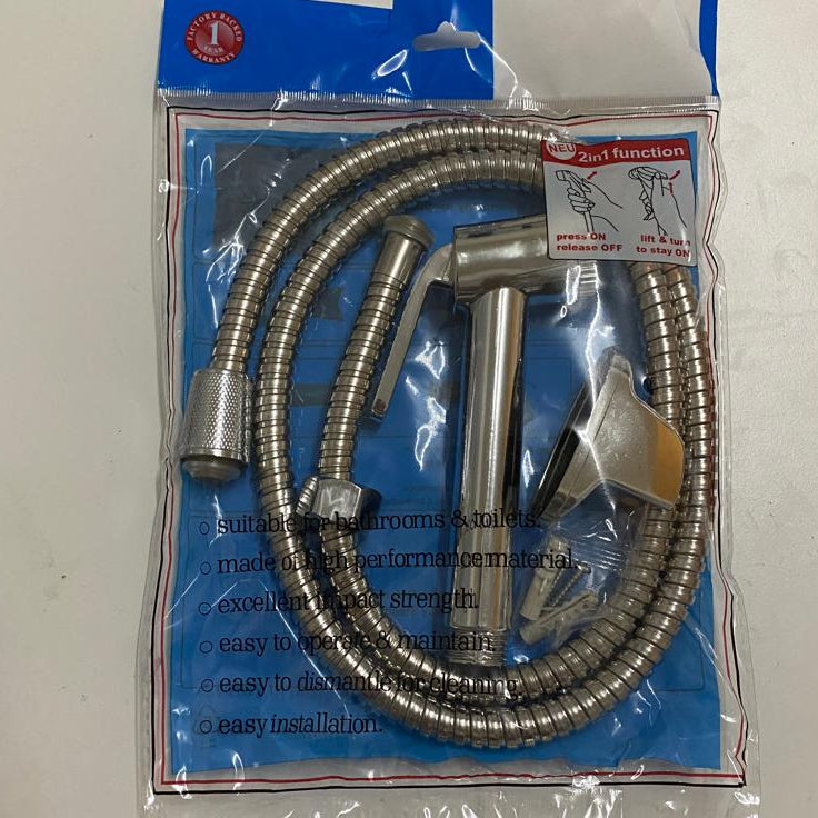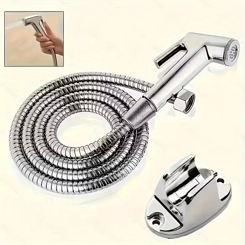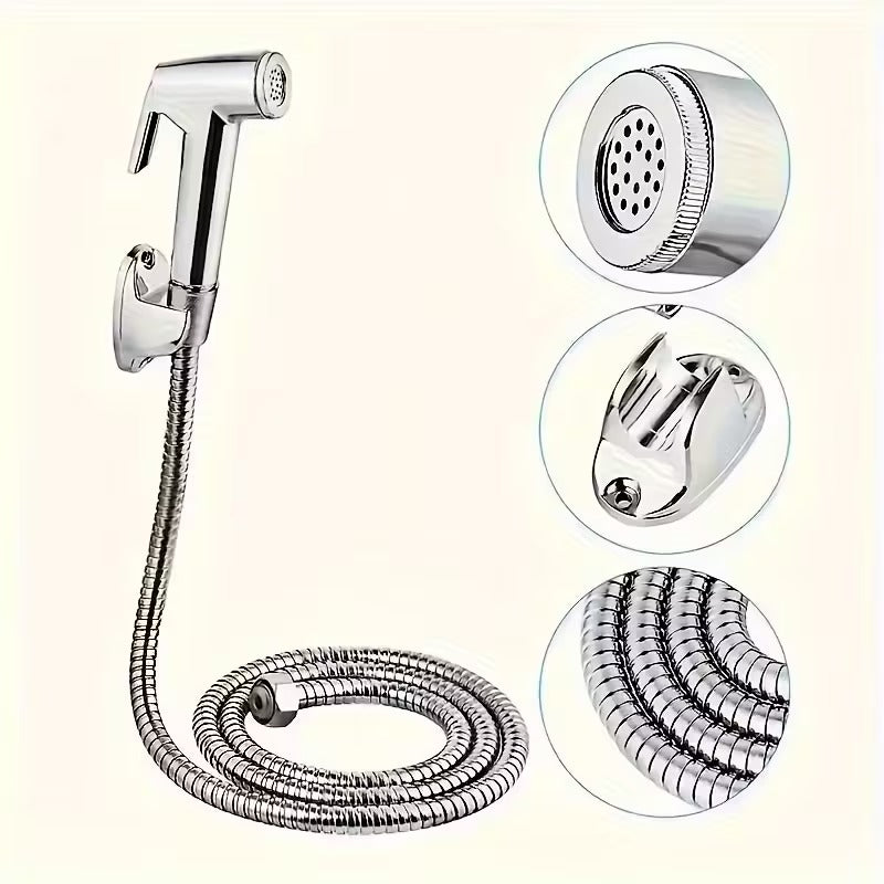 شطّافة حمام كروم، بتيجي مع خرطوم معدني مرن طويل ومقبض للتعليق على الحيط. تصميمها عملي ومناسب للاستخدام اليومي بالحمام. شكلها فضي لامع وبتيجي كاملة مع كل أجزائها للتركيب.