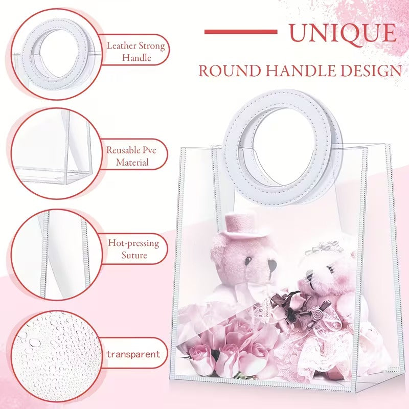 شنطة بتجنن عشان تحط فيها هداياك، شفافة بتبين كل اشي حلو جواتها. ايدها دائرية من الجلد القوي، يعني عملية وكشخة بنفس الوقت. بتقدر تستخدمها أكثر من مرة، ومصنوعة من بلاستيك PVC المتين."